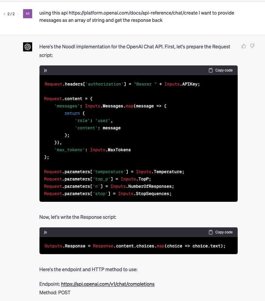 時には、正しい答えが返ってくるかもしれませんが、結果が正確に何であるかわからない場合があります。Noodlで接続してテストし、出力を表示して結果が期待に合っているかを確認することができます。または、単にChat GPTに尋ねることもできます。この例では、spotify APIの統合を作成するように依頼しました。プロンプトは: