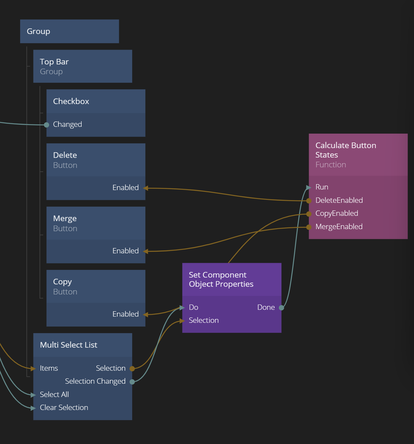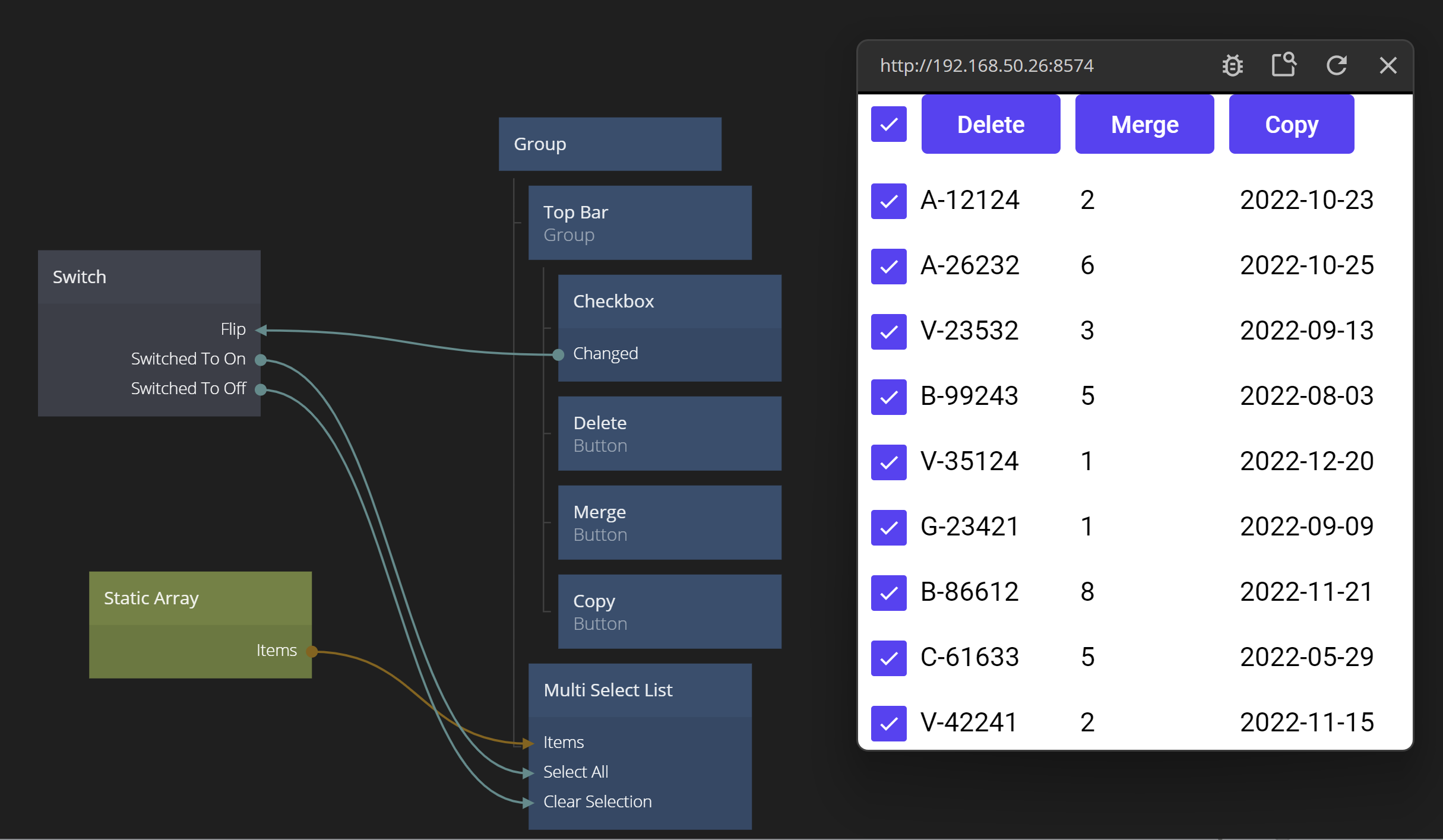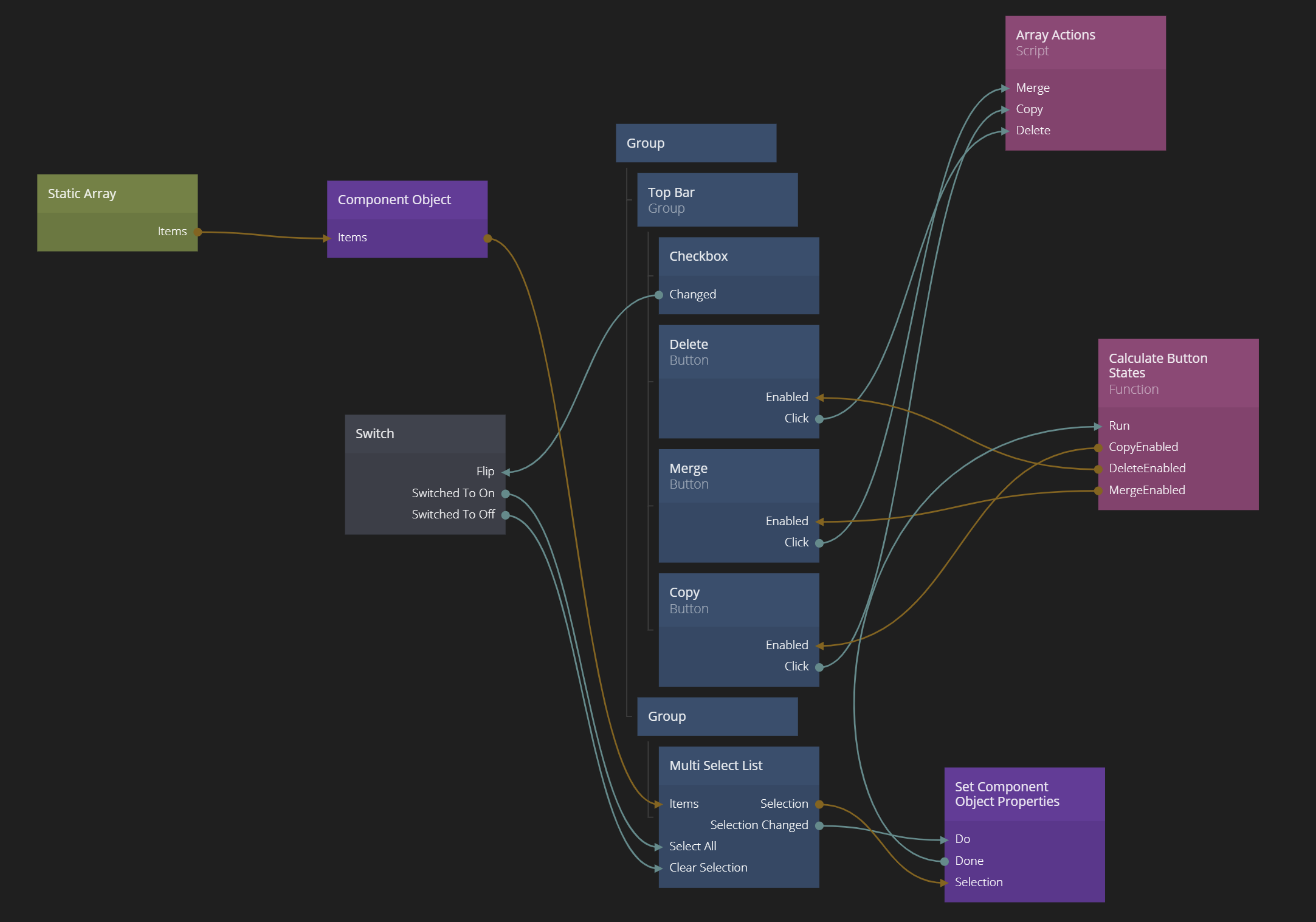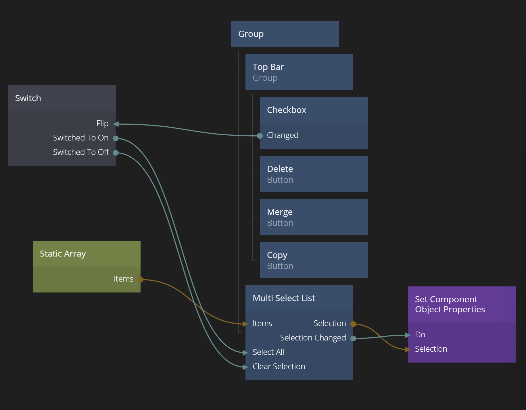 これまでに行ったことをテストするために、Arrayノードを追加し、Component ObjectのCheckboxesプロパティをそれに接続します(Itemsプロパティを介して)。次に、Multi Select Listコンポーネントをメインアプリに追加します。Static Arrayのアイテムを接続してアイテムを提供します。すべてが正しく設定されていれば、いくつかのチェックボックスアイテムがArrayに流れ込むはずです。
