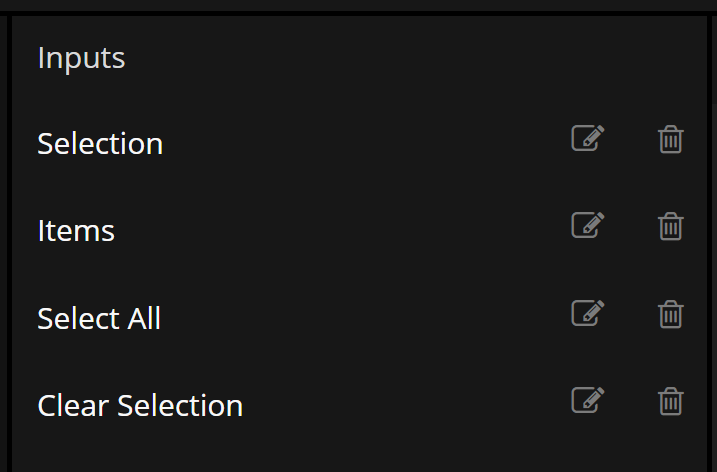 これで、ほぼ空のコンポーネントができました。Component InputsとComponent Outputsを追加します。これらに何を含めるべきかは既にわかっています。つまり、コンポーネントとのやり取り方法です。したがって、Component InputsにSelection、Items、Select All、Clear Selectionのポートを追加します。