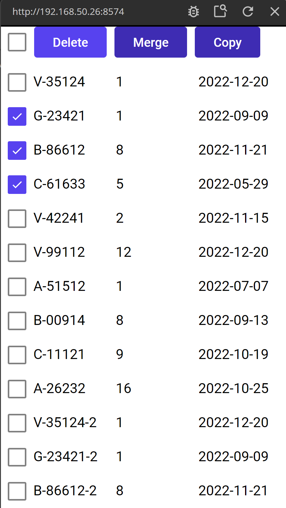 この例では、例えばeコマースシステムでの、order_nbr、quantity、delivery_dateを持つ注文のシンプルなコレクションを扱います。アプリは注文をリスト表示し、ユーザーが標準的なマルチセレクトの相互作用を使用して複数の注文を選択できるようにします。選択した注文は、削除、コピー、または_マージ_することができます。実際の操作がどういう意味を持つのかは、実装していく中で詳しく見ていきます。また、全ての項目を_選択_または_選択解除_することも可能です。