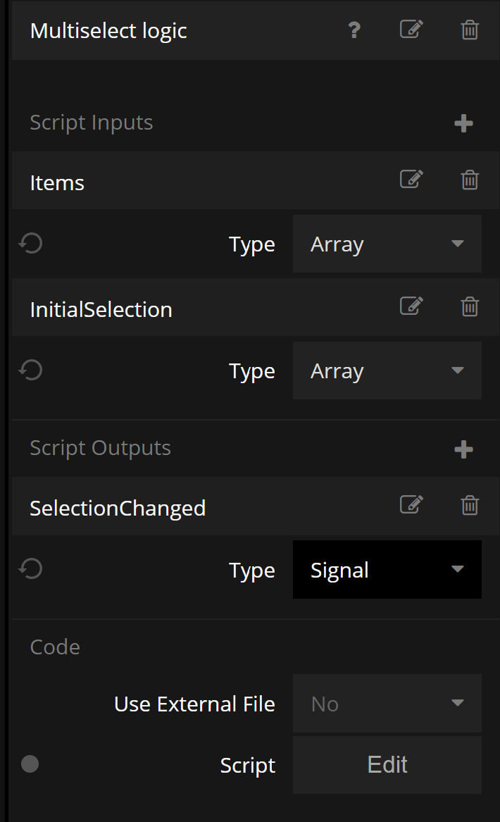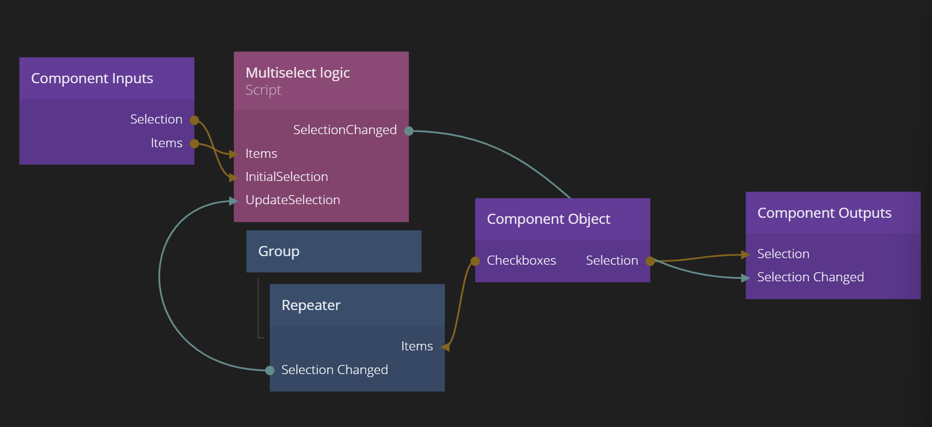 このコードは、入力されたItems(Script.Inputs.Itemsを通じて参照される)を通過し、それぞれに対して新しいラッパーObject(Noodl.Object.createを使用)を作成します。チェック状態を確認し、初期選択配列に基づいてtrueまたはfalseに設定します。また、ラップされたObjectへのポインタをValueプロパティに保存します。