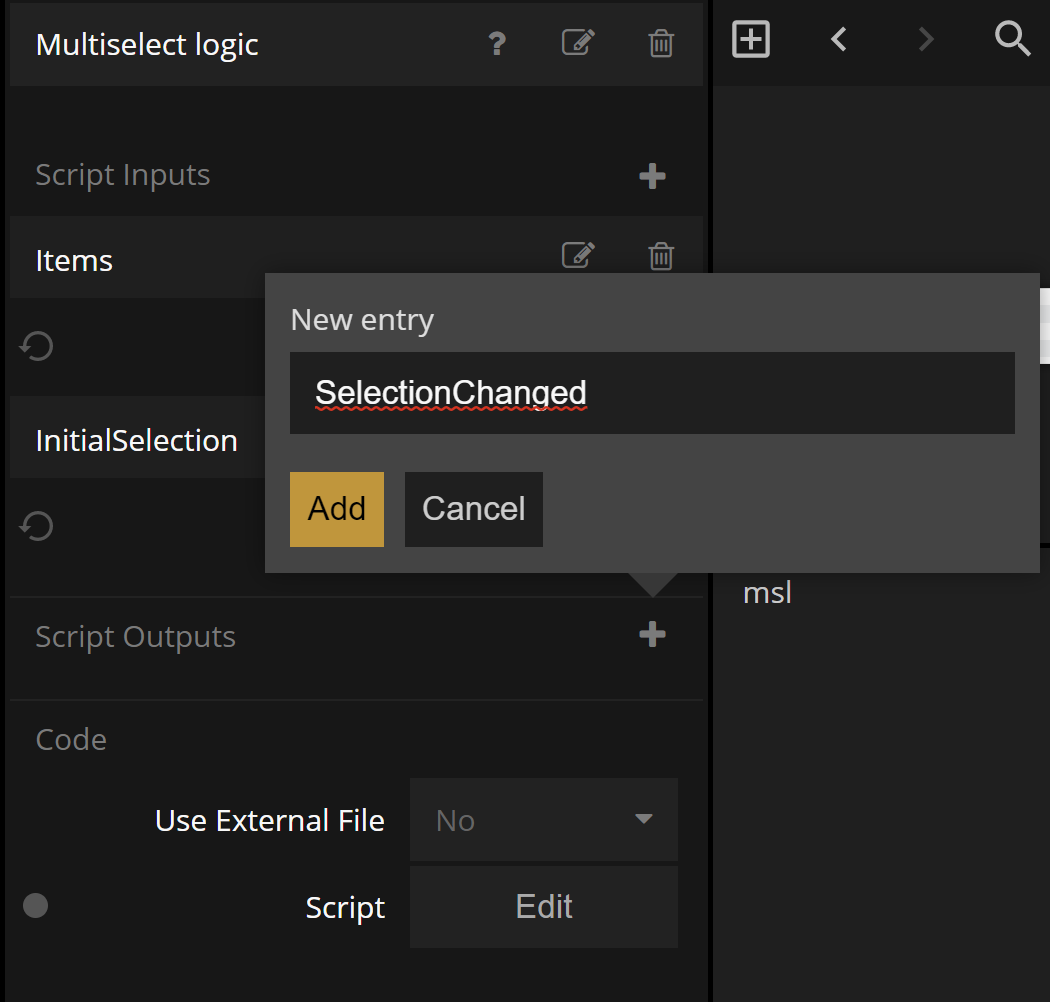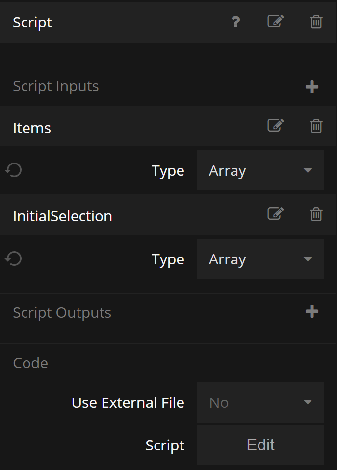 スクリプトノードの入力がまだ設定されていない場合(この場合のItems入力やInitialSelectionなど)、それらはundefinedの値を持ちます。コード内でこのケースを明示的にチェックすることは、しばしば良いアイデアです。