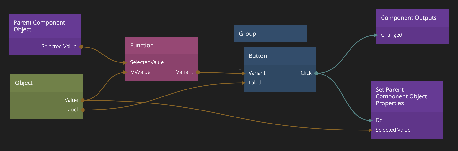 - ここで、Set Parent Component Object Propertiesノードという新しいアクションノードを紹介します。これは、コンポーネントオブジェクトのプロパティを設定するために使用されます。しかし、このコンポーネントインスタンスのコンポーネントオブジェクトではなく、代わりに最も近い視覚的親のコンポーネントオブジェクトです。この場合(このコンポーネントがリピーターのテンプレートとして使用されているため)、セグメントコントロールコンポーネントになります。つまり、リピーター内の各セグメントコントロールボタンコンポーネントは、クリックされると、そのValueをComponent ObjectのSelected Valueとして設定します。