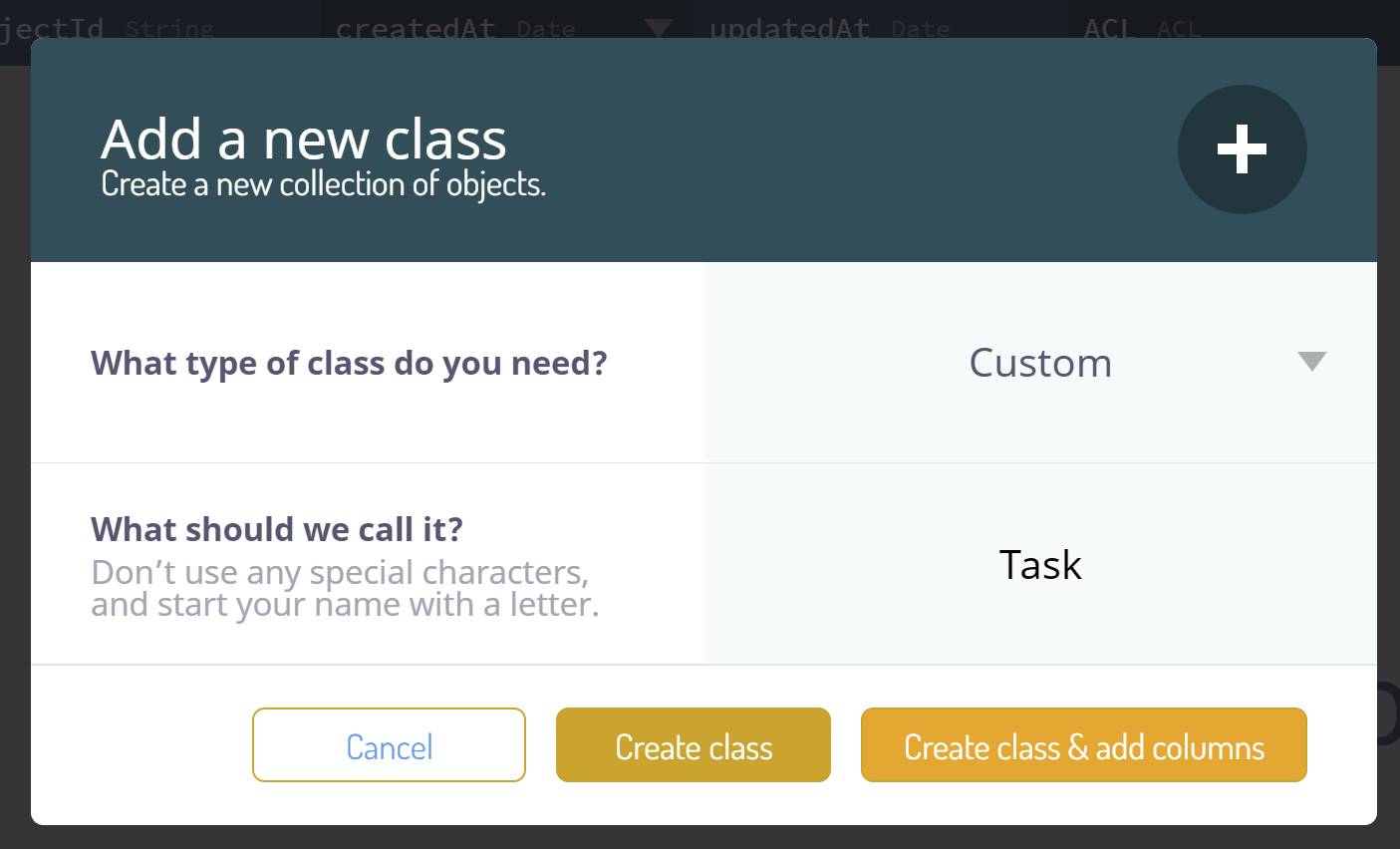 次に、クラスに名前を付けます。例えばTaskと入力し、タイプがCustomであることを確認してください。Create class and add columnsを選択できます。