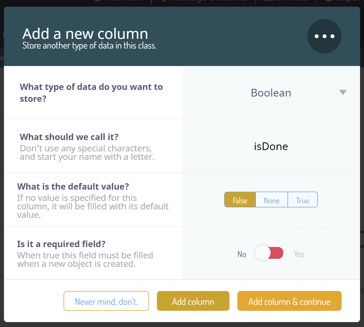 新しいレコードがクラスに追加されるためには、カラムが必須かどうかを選択することもできます。trueに設定されている場合、そのカラムに値が提供されていない新しいレコードの挿入は拒否されます。今回はそれを望んでいないので、両方のカラムでNoの状態を維持します。