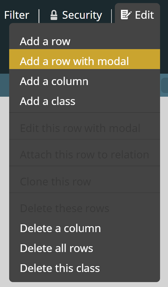 Taskクラスに新しいレコードを追加する時が来ました。Add a rowボタンをクリックするか、EditメニューからAdd rowまたはAdd row through modalを選択することでレコードを追加できます。後者のボタンをクリックしましょう。これにより、新しいレコードの各カラムの値を入力できるフォームが表示されます。