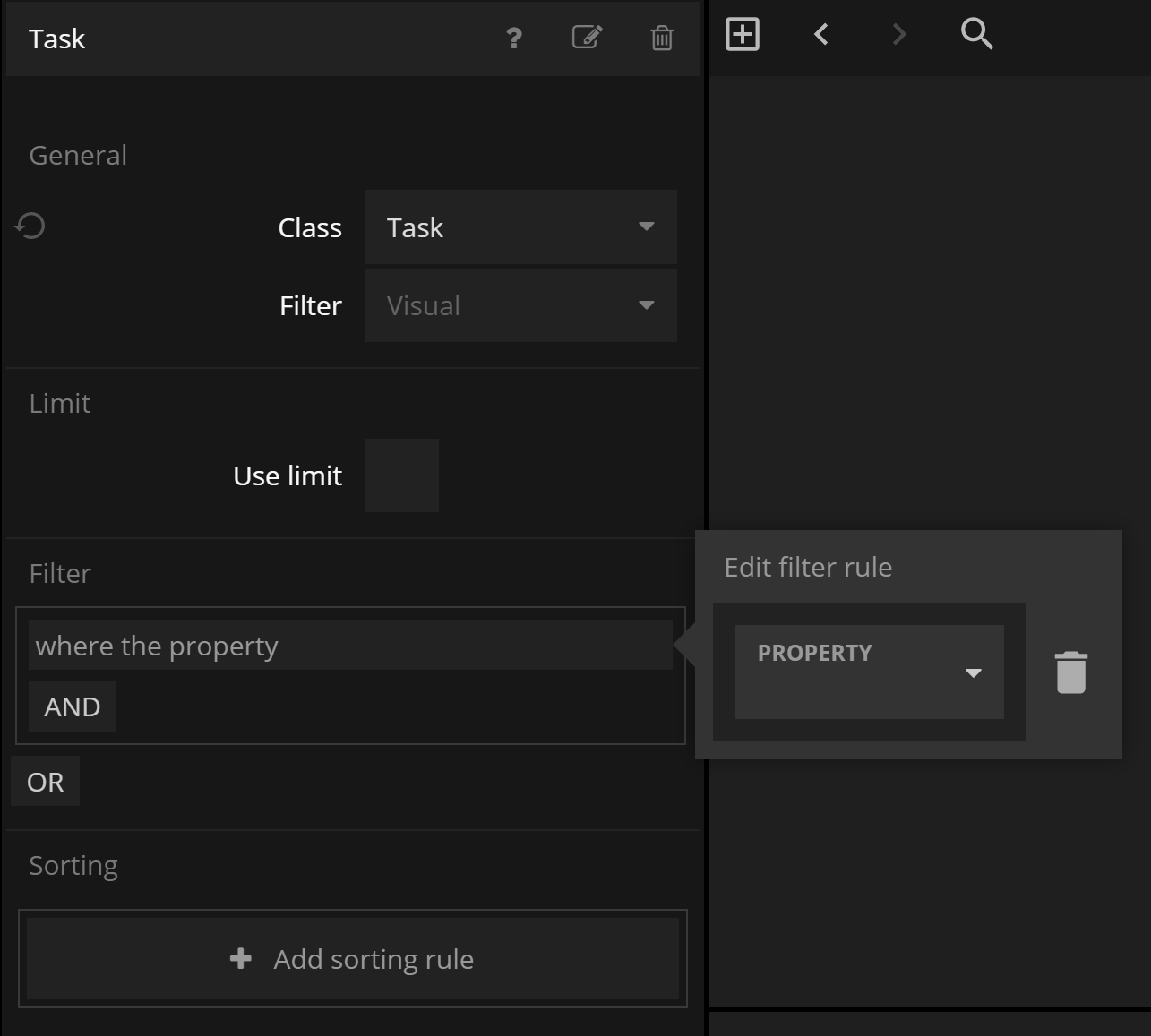 これで、未完了のタスクのみを表示するフィルターを追加したいと考えています。メイン画面のクエリレコードノードをクリックしてから、フィルタールールを追加ボタンをクリックします。