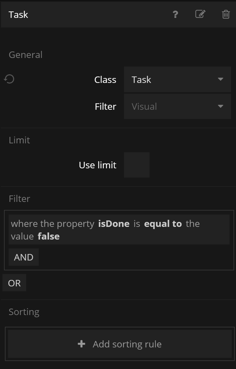 このケースでは、isDone = falseである、つまりまだ完了していないタスクのみをフィルタリングしたいと考えています。したがって、私たちのフィルターは次のようになります: