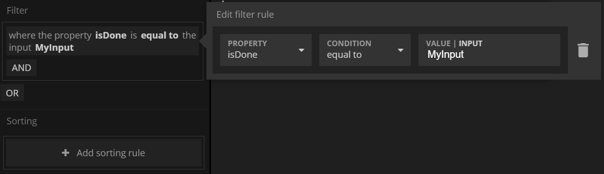 入力に"isDoneFilter"という名前を付けます。これで、クエリレコードに新しい入力が使用できるようになりました!入力がtrueに設定されている場合、完了したタスク(isDone = true)のみがフィルタリングされ、falseの場合はその逆になります。