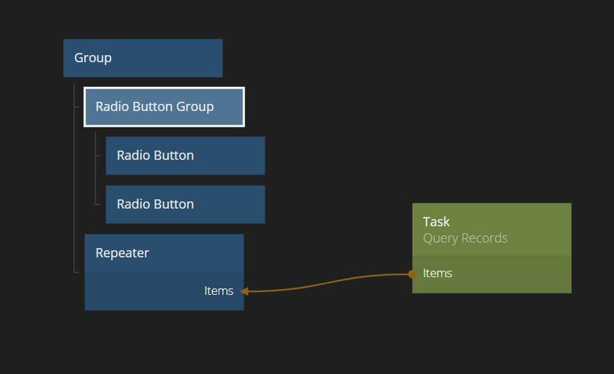 ボタンのラベルが正しく設定されていること("未完了を表示" / "完了を表示")、それぞれの値が"未完了" / "完了"に設定されていることを確認してください。また、ラジオボタングループの値は"未完了"になっています。これがデフォルトの状態になります。ラジオボタングループの値の出力を使用して、クエリレコードのフィルタ設定を制御します。