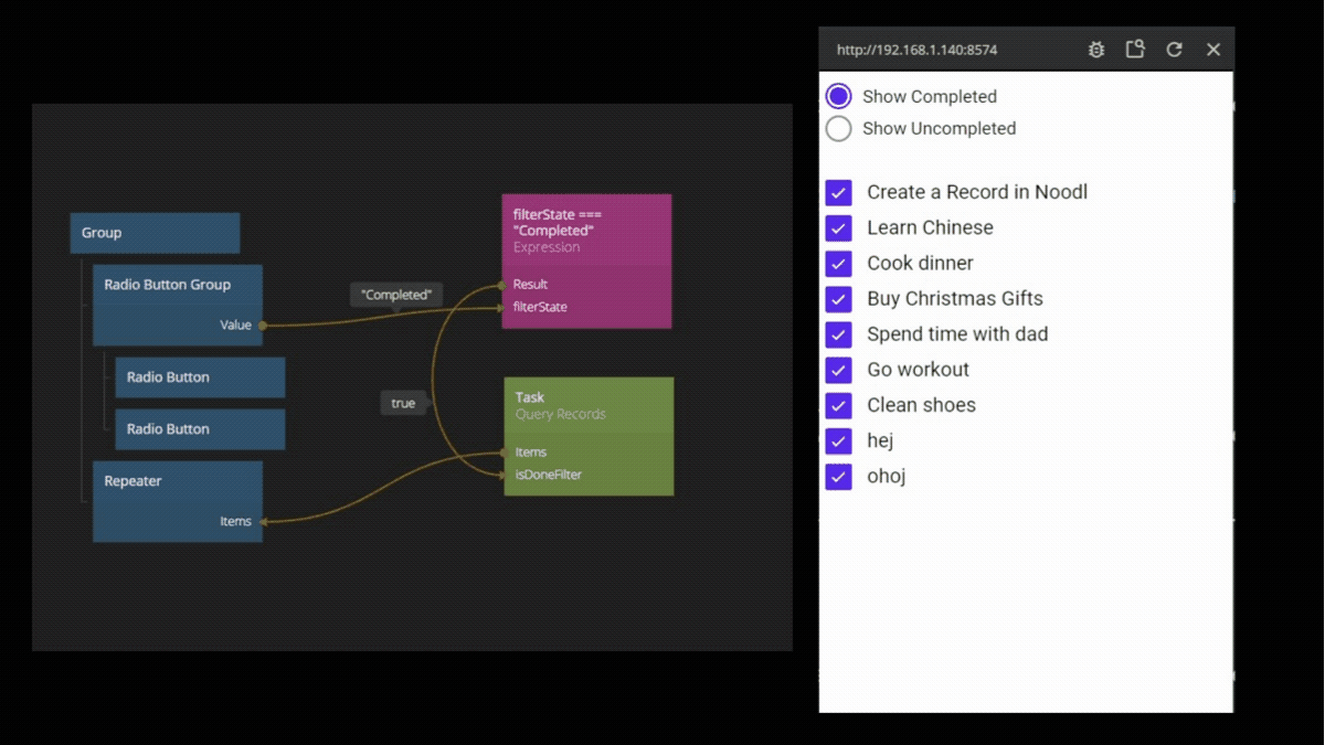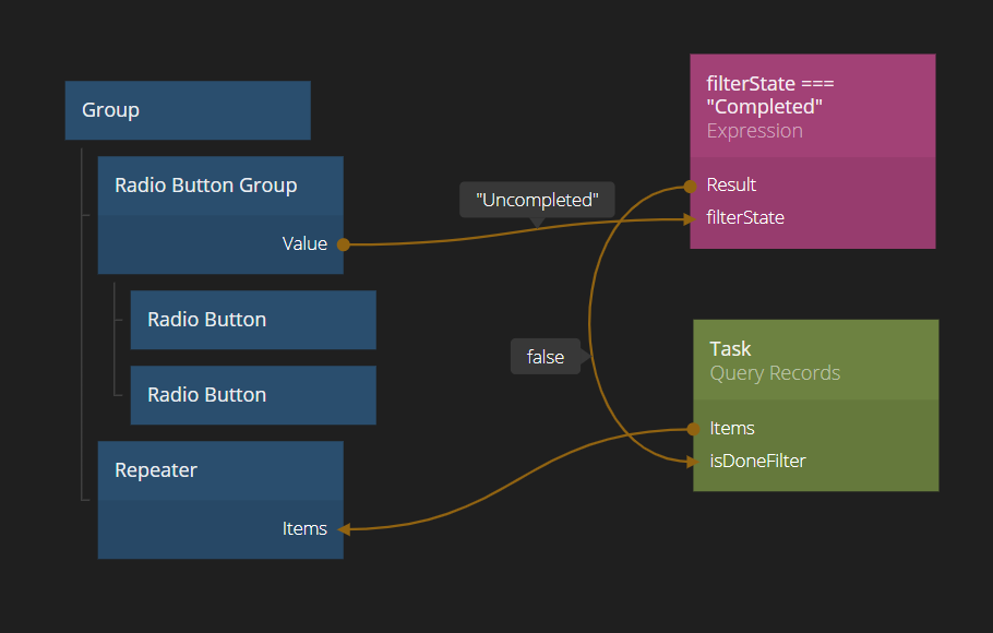 と設定することで行います。式ノードの出力は、入力が"完了"の場合はtrue、それ以外の場合はfalseになります。最後に、式の出力をクエリレコードに接続します - そして、ラジオボタンをクリックするとフィルタリングが切り替わります。