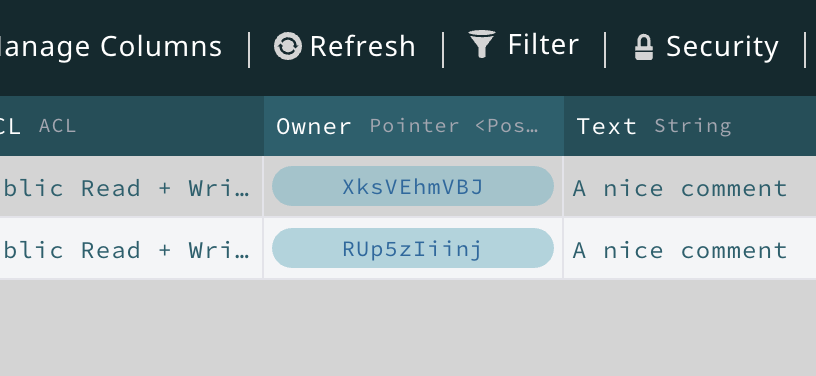 ポインターを設定するには、Post レコードの id を渡すことができます。例えば、新しい_Comment_ レコード を作成するときにこれを行うことができます。ポインターとして指定されたレコードが正しいタイプであることが重要です。この場合は_Post_です。