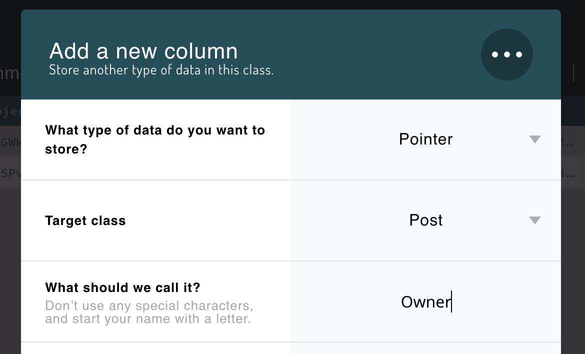 ポインタープロパティは、その_Id_を介して特定のクラスの別のレコードを参照できます。この場合、Comment の所有者である Post を参照したいとします。そこで、Ownerと呼ぶプロパティを_Comment_ クラスに作成し、ポインター タイプを与えて_Post_ レコードを指すように指定します。