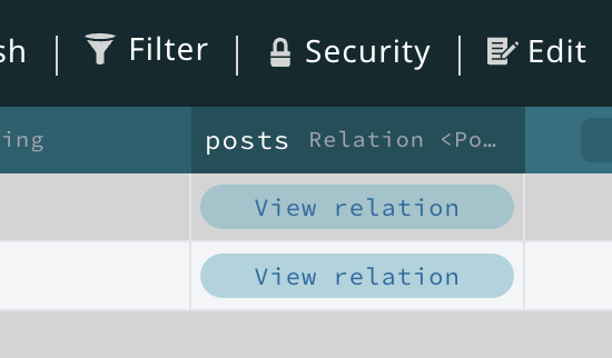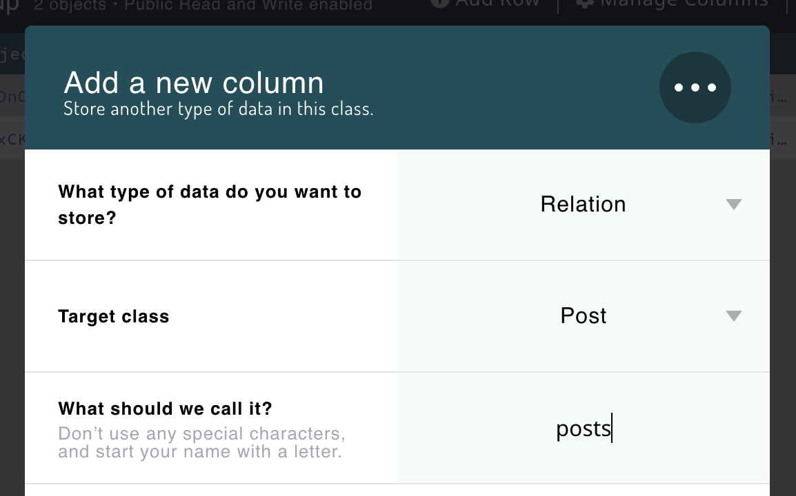。この場合、前の例での後方向のポインティングメカニズムを使用することはできません。Post から_Group_ への単一のポインターでは機能しません。なぜなら、Post は多くの_Groups_ の一部である可能性があるからです。代わりにリレーションと呼ばれる概念を使用する必要があります。Group レコードに_Relation_ タイプの新しいプロパティを作成し、ポインターと同様に_タイプ_を指定して名前を付ける必要があります。