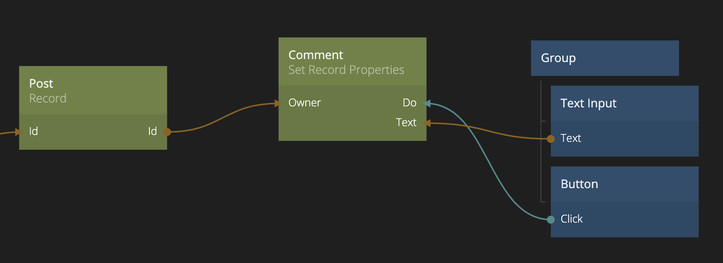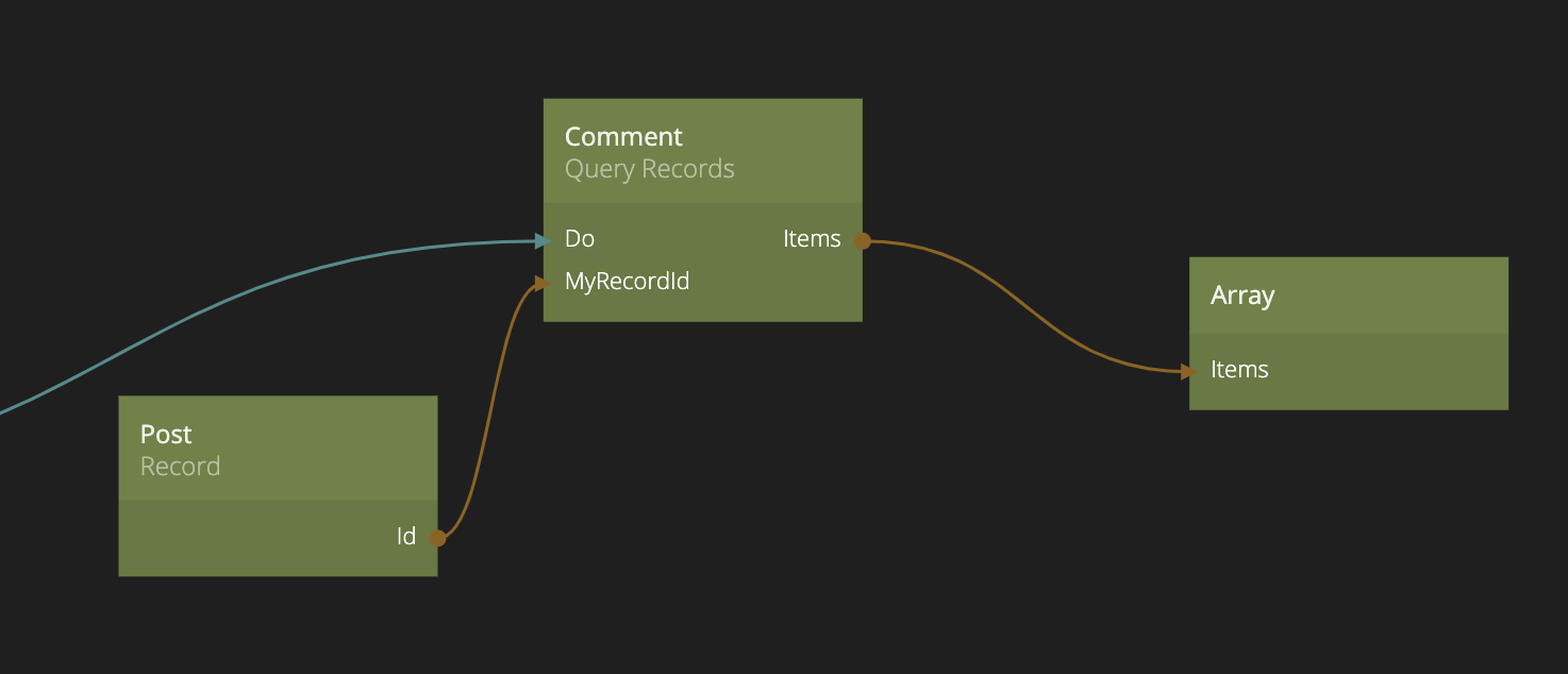 後で、Post に対する全ての_Comment_ を取得したい場合は、Query Records ノードを使用して、Owner プロパティが特定のコメントを指している全てのCommentsを求めるだけです。
