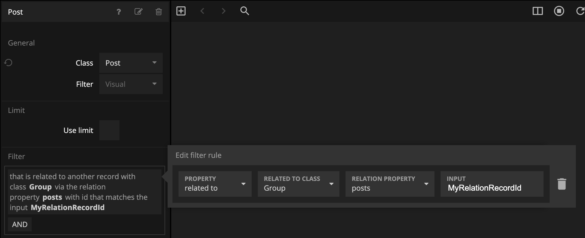 1. Group に関連する全ての_Post_ を見つけたい場合。その場合、Post のクラスのQuery Recordsを作成します(クエリから_Posts_を返したい)。次に、以下の画像に従ってフィルターを設定できます