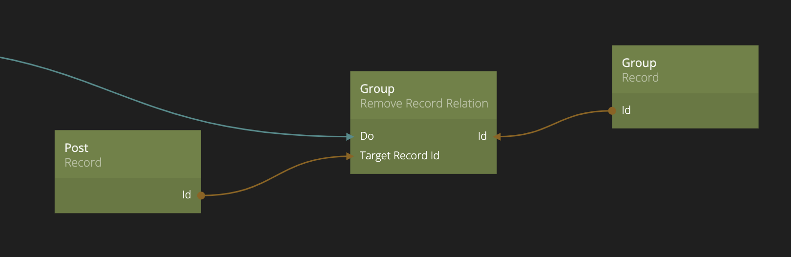 レコードに_Relation_ プロパティがある場合、Add Record RelationRemove Record Relation ノードを使用して管理する必要があります。これらのノードでは、リレーションプロパティを持つレコードid(この場合はGroup)と、関係に追加または削除したいレコードidを提供する必要があります。