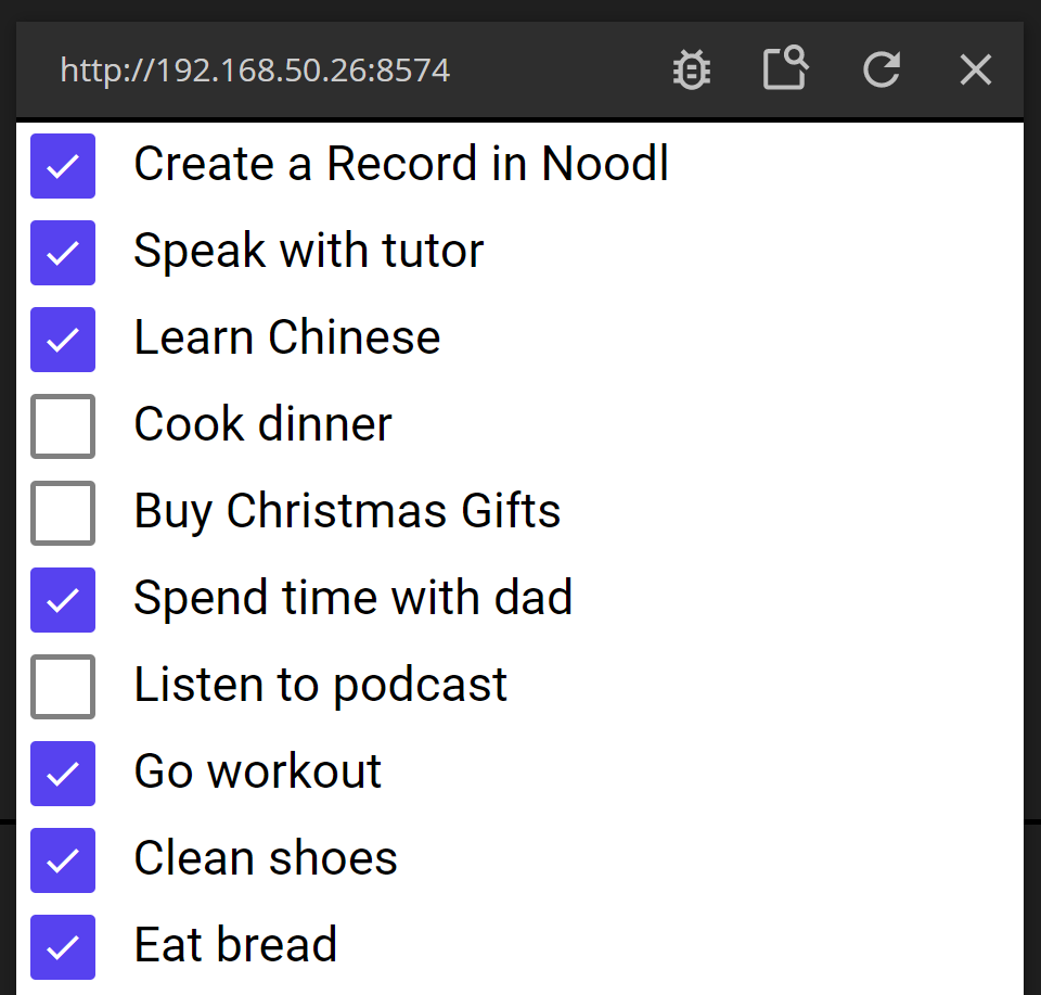 完了しました!異なるタスクをクリックして、isDoneプロパティが正しく保存されているかをダブルチェックするために、ダッシュボードを表示してください。ビューを更新するためにダッシュボードでRefreshを忘れずに押してください。
