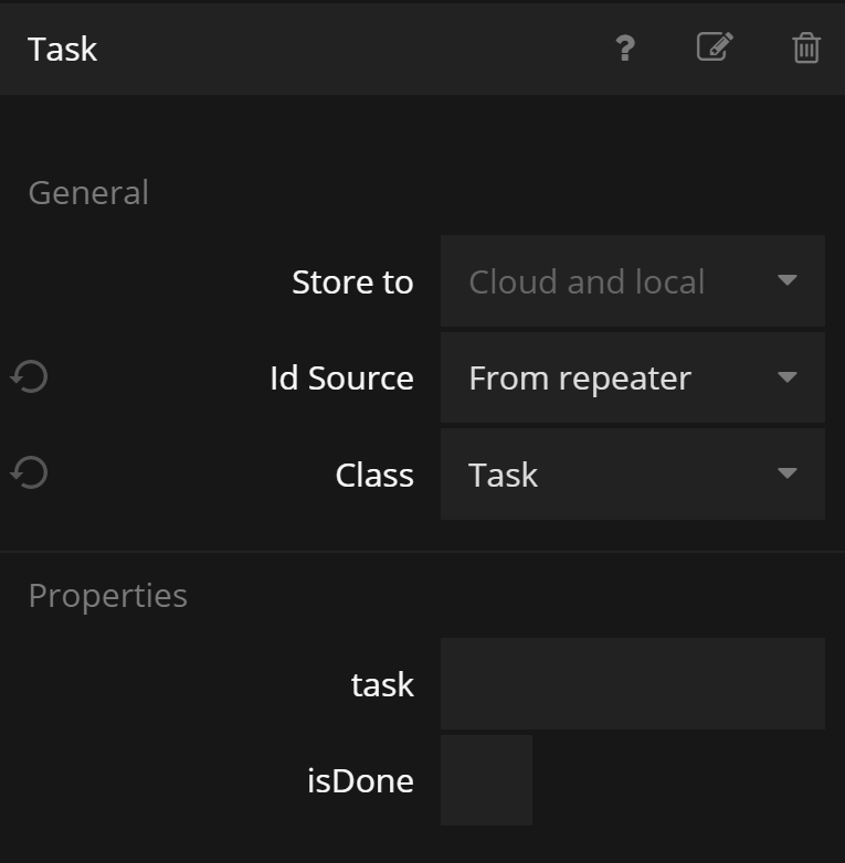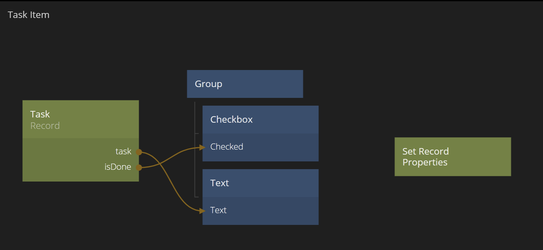 残りの2つの作業は、チェックボックスをisDoneプロパティに接続し、Set Record PropertiesのDoシグナルをトリガーすることです。チェックボックスの状態が更新されるたびに保存したいので、チェックボックスから出てくるChanged