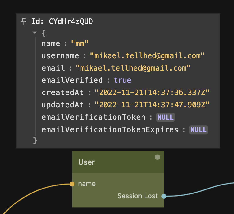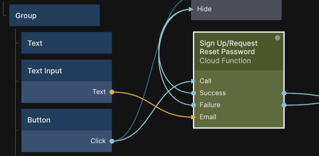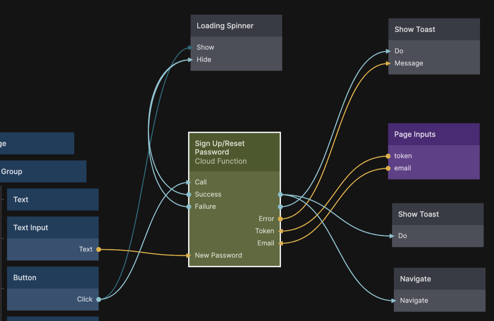 ユーザーがリセットボタンを押したとき、リンクのクエリパラメータとPage Inputsノードを介して受け取った秘密トークンとユーザーメールを供給して、Sign Up / Reset Passwordクラウド機能を呼び出します。