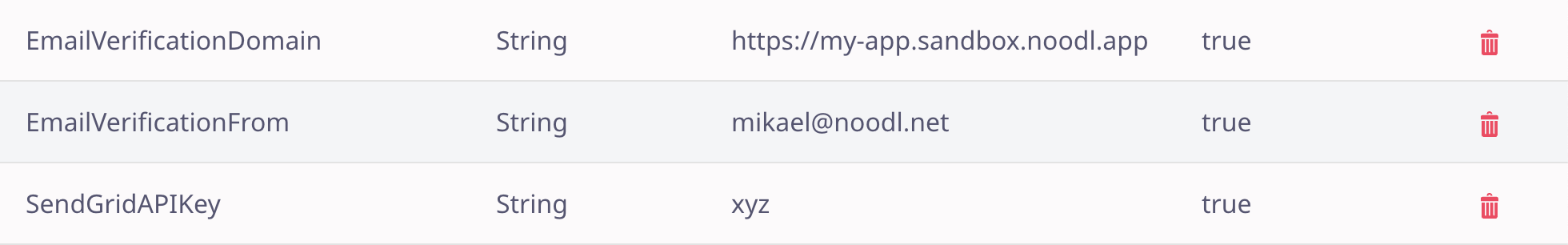 • EmailVerificationFrom これは、ユーザーに検証メールを送信する際に「from」メールとして使用されるメールアドレスを入れる場所です。これがSend Grid(アプリケーションで使用しているメール送信サービス)で有効なメールであることが重要です。