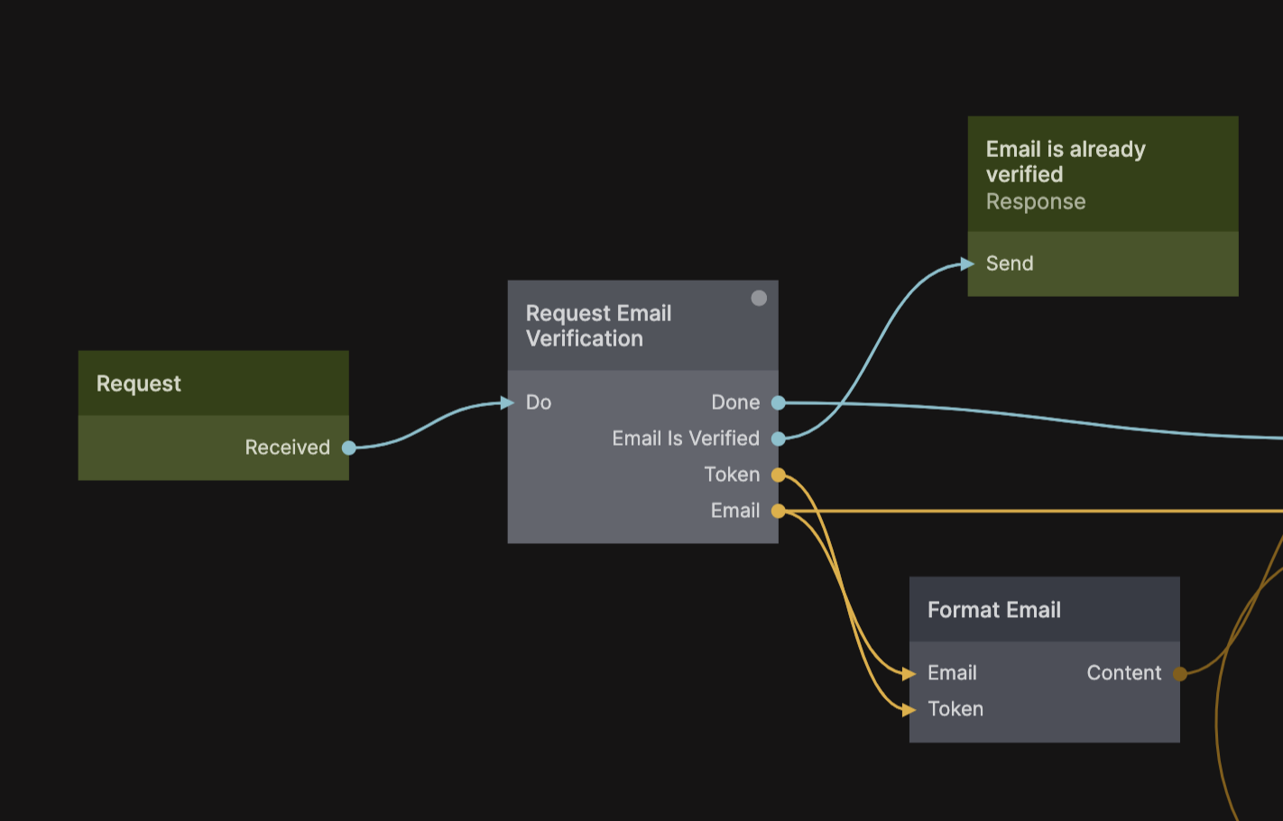 このアクションは、秘密トークン(一時的なパスワードのような、文字のランダムな文字列)を作成し、現在のユーザーと共に保存します。このトークンは後でメールの一部としてユーザーに送信されます。メールがすでに検証されている場合、Email Is Verifiedにシグナルが発行され、クラウド機能のエラー結果として返されます。