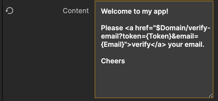 • {Email} これはユーザーのメールであり、次のステップでユーザーを取得してメールを検証済みとしてマークするために使用されます。