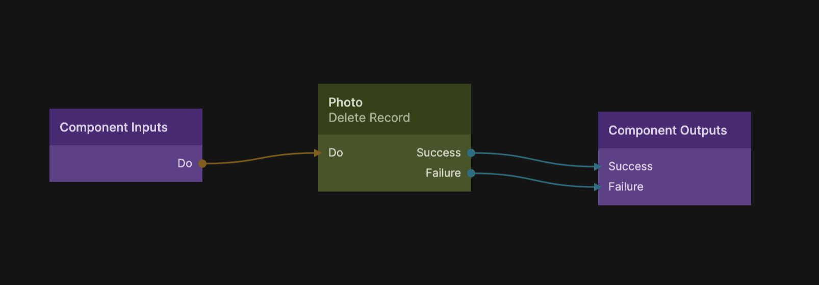 成功した場合、写真はRun Tasksという便利なノードに渡されます。このノードは、それに供給された配列の各アイテムに対してロジックコンポーネントタスクを実行し、すべてが処理されたときにDoneを報告します。ロジックコンポーネントを作成する必要があります。私はそれをDelete Taskと呼び、クラウド関数の子コンポーネントとして追加しました。