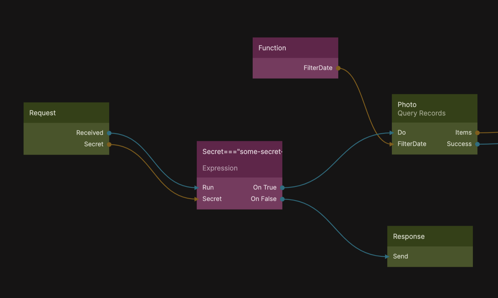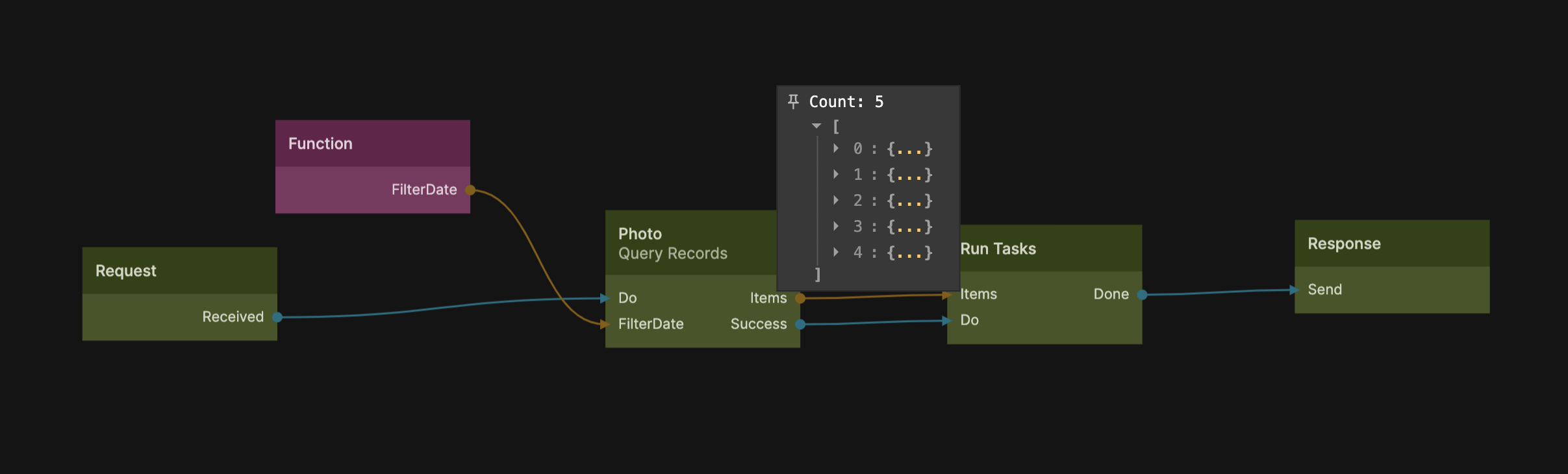 この関数には、48時間より古いPhotosをすべて見つける小さなロジックフローを追加します。これは、Query Recordsノードと日付フィルターを使用し、小さなFunctionスニペットを介して比較したい日付createdAtを渡すことで行います。