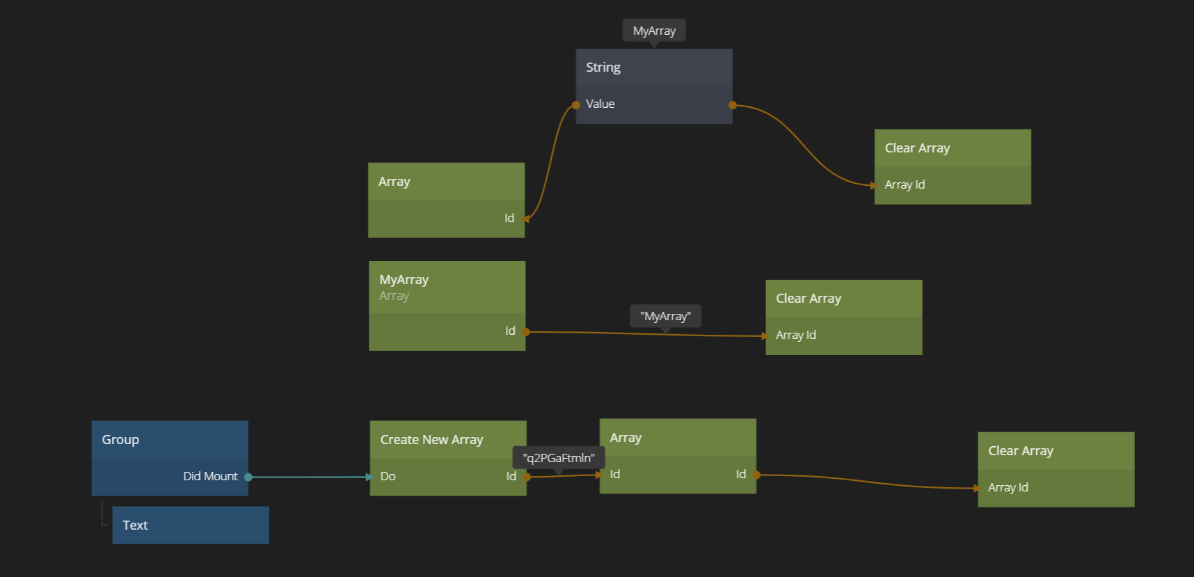 最初のケースでは、配列ノードのIDが文字列ノード(または例えば変数)に格納され、それが異なるノードで配列を参照するために使用されます。