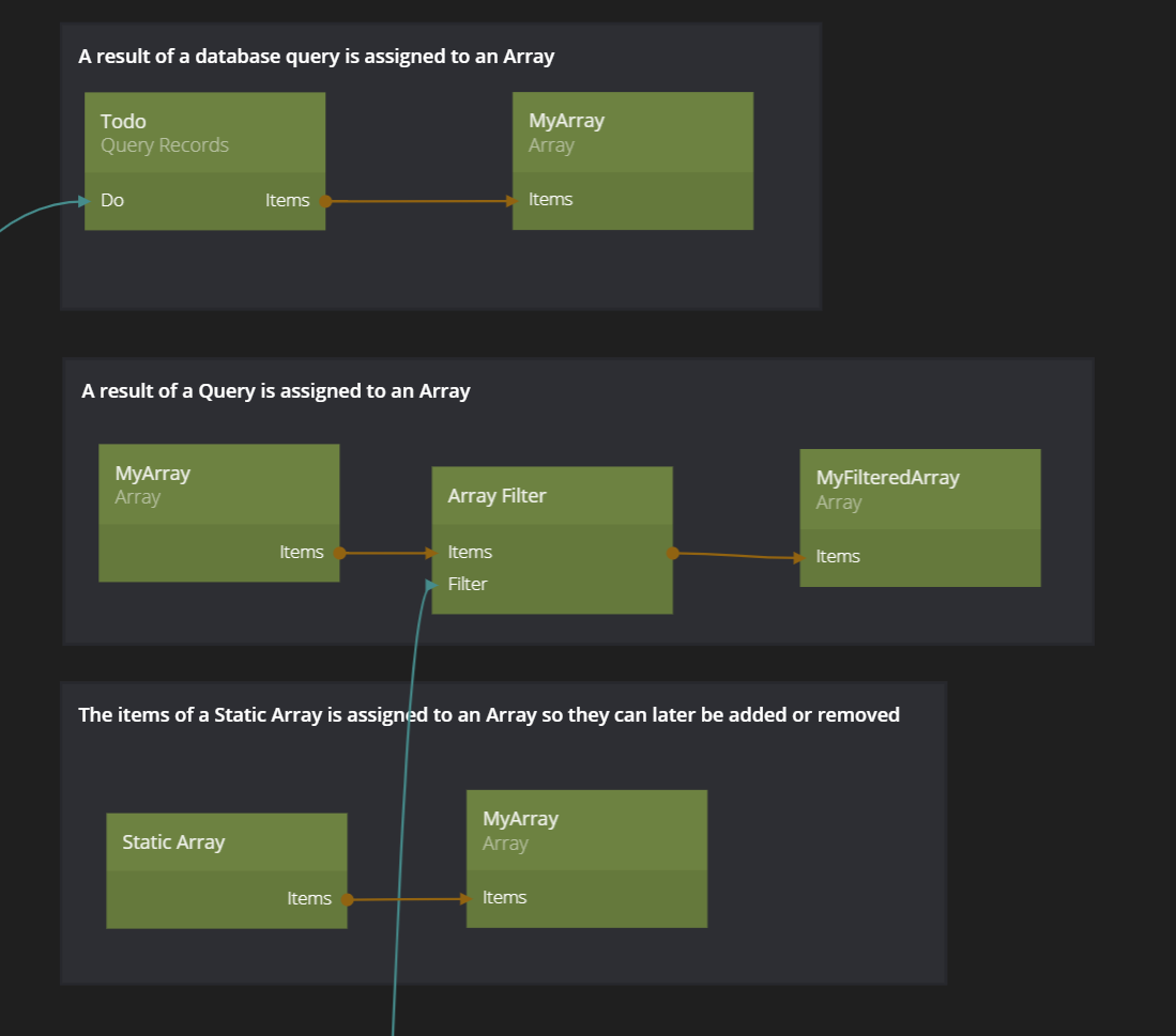 配列ノードのアイテム入力にアイテムを簡単に割り当てることができます。これは、たとえばレコードをクエリを通じてデータベースからクエリを行うときや、配列フィルタや静的配列の結果を処理するときなどによく行われます。以下に3つの例を示します。