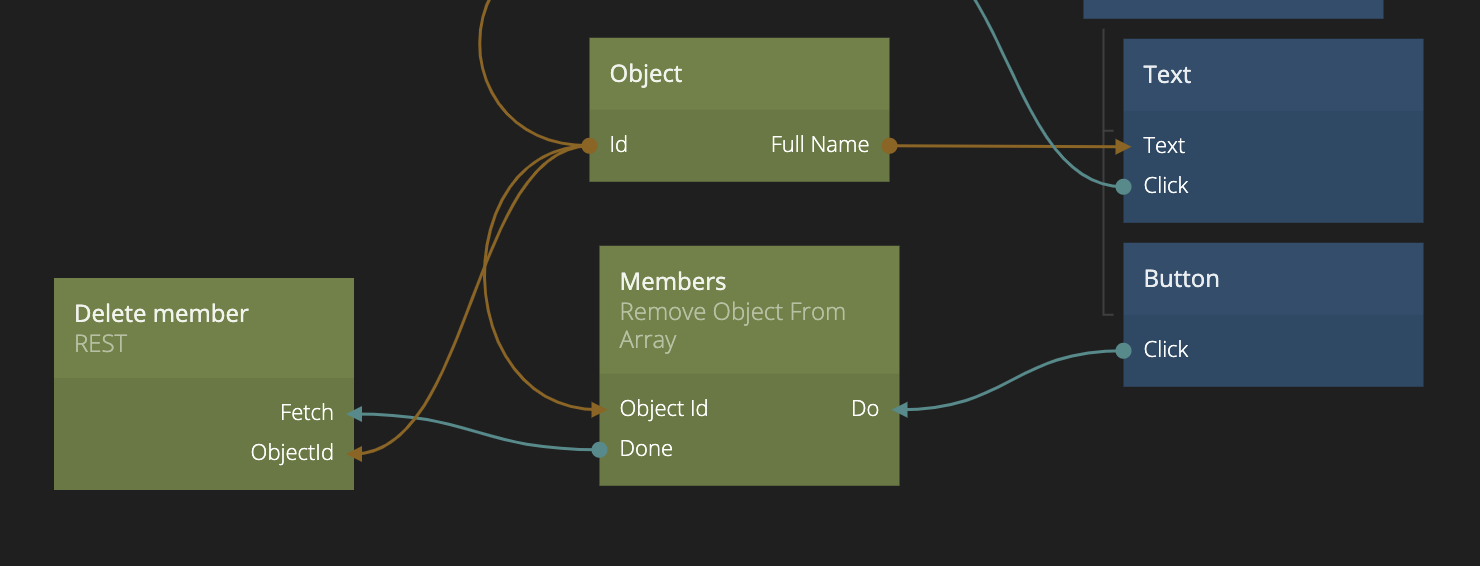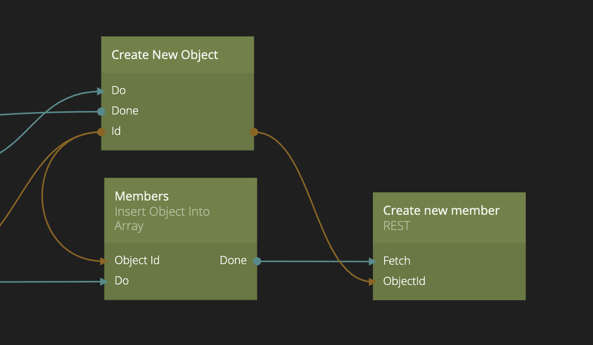 This is, when the newly created member object have been added to the Array we will trigger the REST request by connecting the Done output signal from the Insert Object Into Array node to the Fetch input on the REST node. We will also make sure to connect the Id of the newly created object to the custom ObjectId input that we are using in our request script in the REST node.