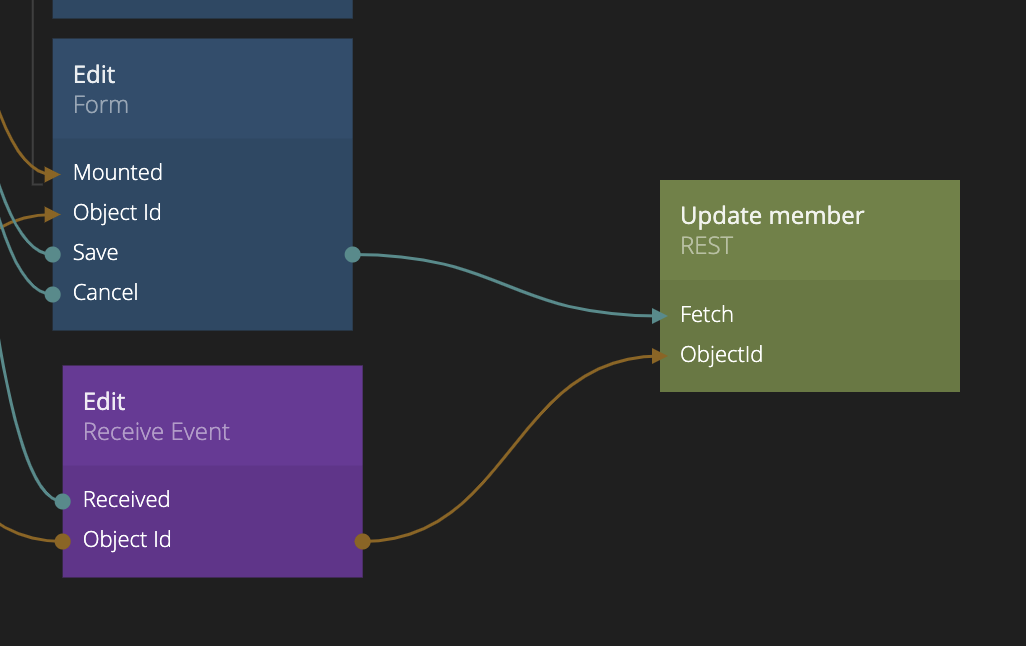 With that in place we can hook it up to the output signal Save that we send from the edit form component. We also need the Object Id as before, and this we can get from the Edit event, that is the Receive Event node. That is the same Object Id that we pass to the edit form component when it is shown. It will look something like this: