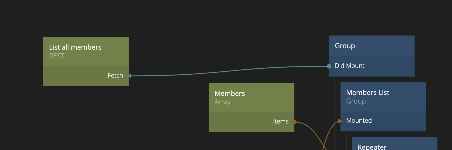 We will simplye create a REST node and change the Resource property to the URI above (with your own base id). Then we will connect the Fetch input of the REST node to the Did mount signal output of the root Group node. This will make sure that we perform the request as soon as the Group node becomes visible. I gave the node a new label "List all members", just to keep track of what it is doing.