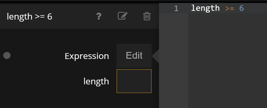 Then create an Expression node. We want to check that the length of the name is 6 characters or more. So edit the expression and write