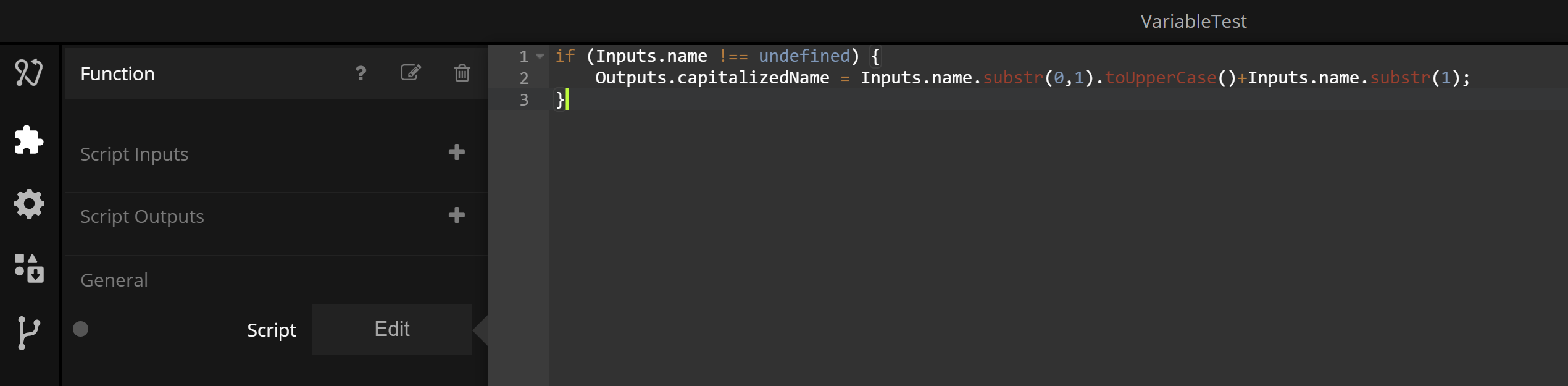 It's not important right now that you understand exactly how the Javascript works, but it will capitalize the first letter of what you feed into the Function node and set it on the output named capitalizedName.