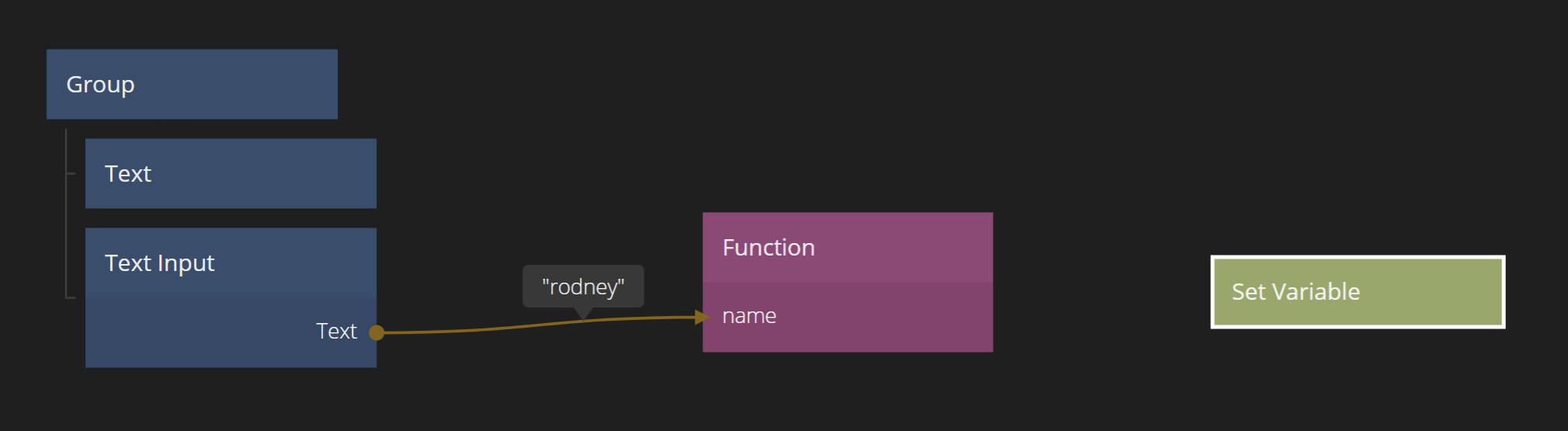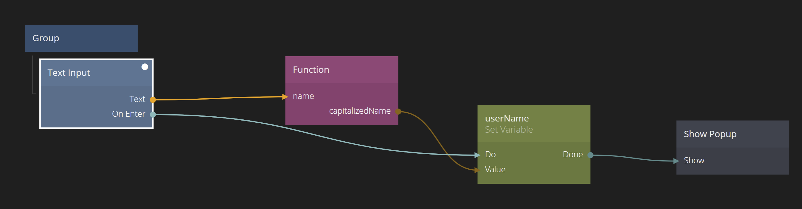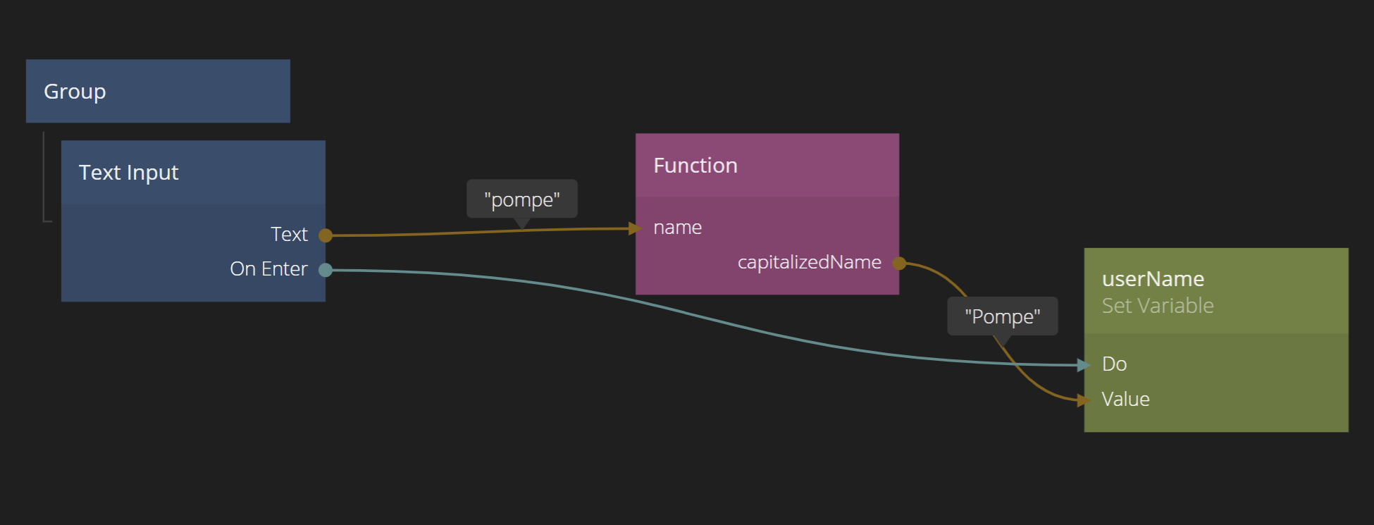 We have one more thing we need to do to actually store the value in the Variable. We need to trigger the Do signal in the Set Variable node. This makes it possible for us to control exactly what we save. Again, as the user is typing in the TextInput the capitalizedName output will keep updating (try it!) and we only want to save once the user press Enter.