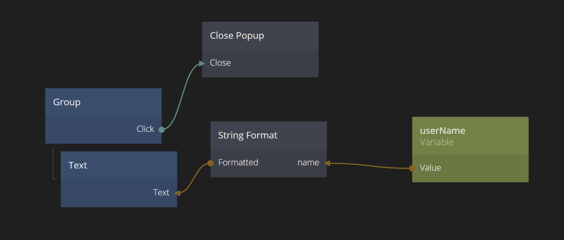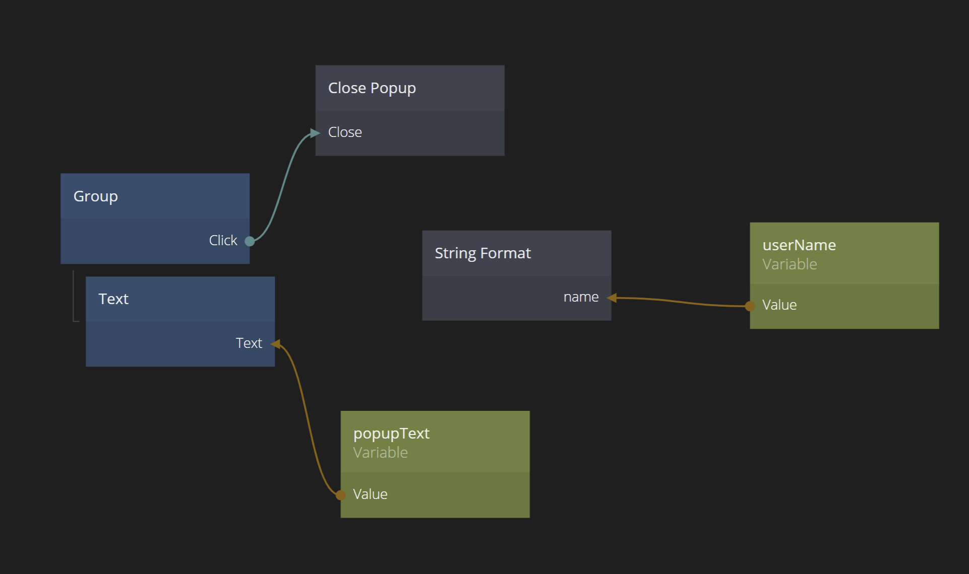 So using the pattern above we introduce a new Variable in the "Hello Popup". Let's call it popupText. We connect its value to the text node and remove the old connection.