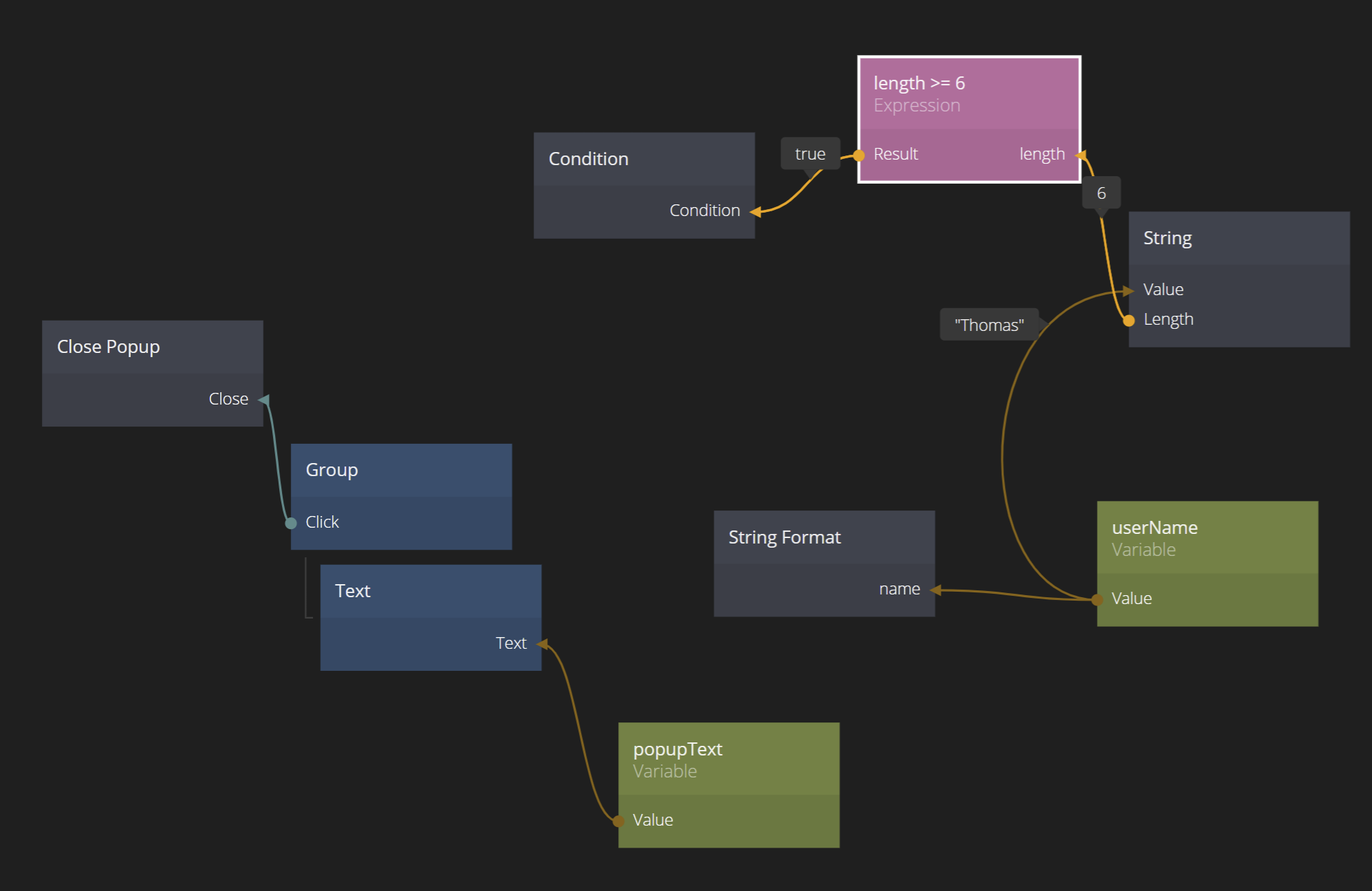 Now we need to check the length of the provided name. This is easy using a combination of a String node, an Expression node and a Condition node.