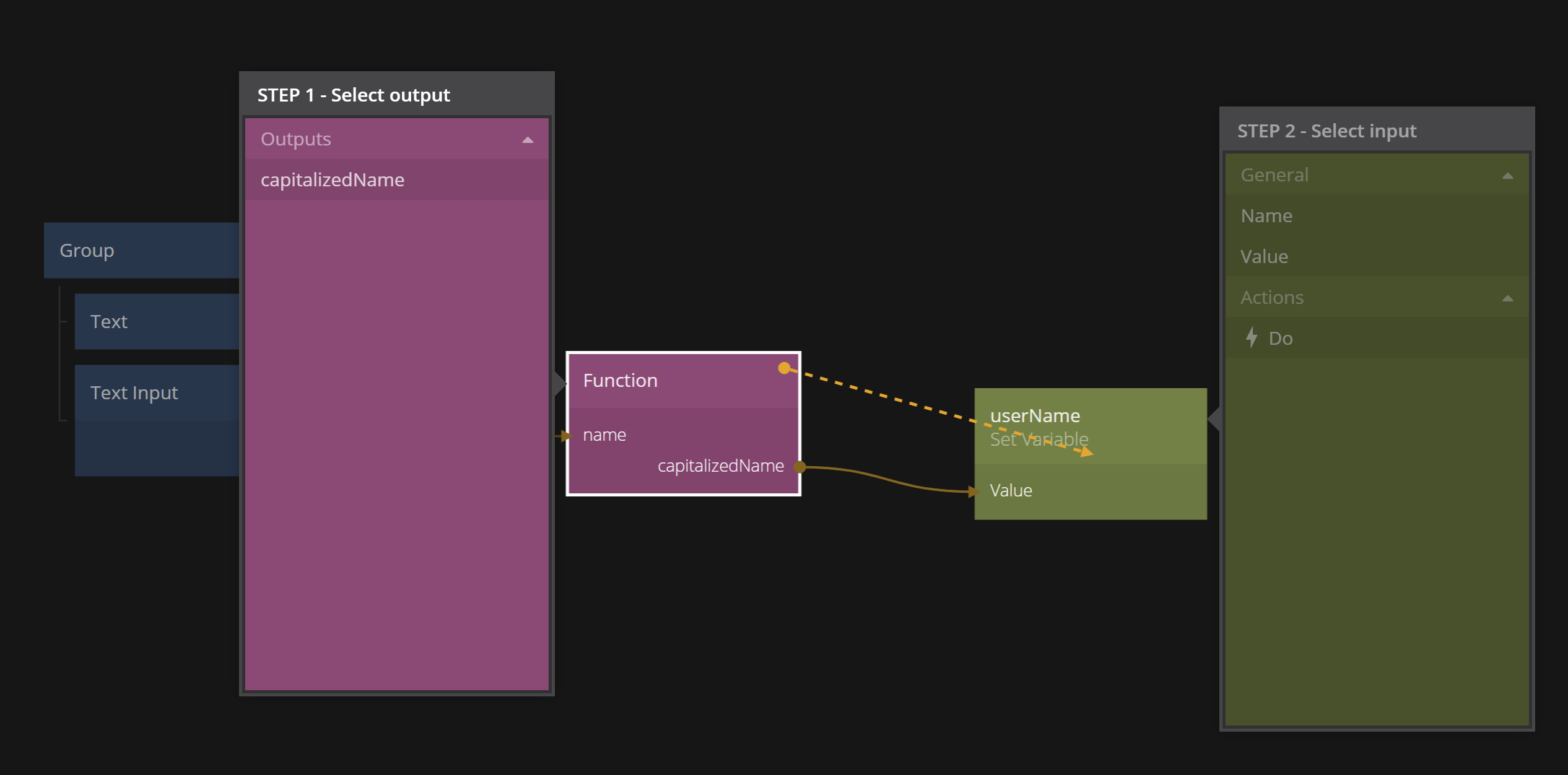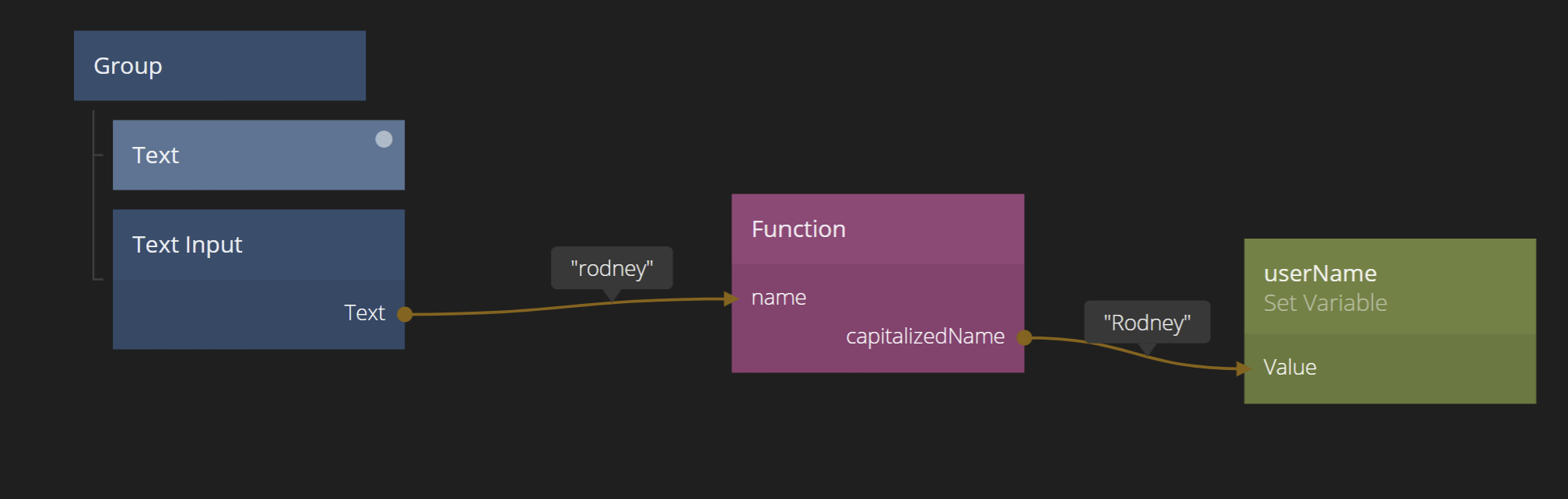 Then connect the capitalizedName output from the Function node to the Value input of the Set Variable node.