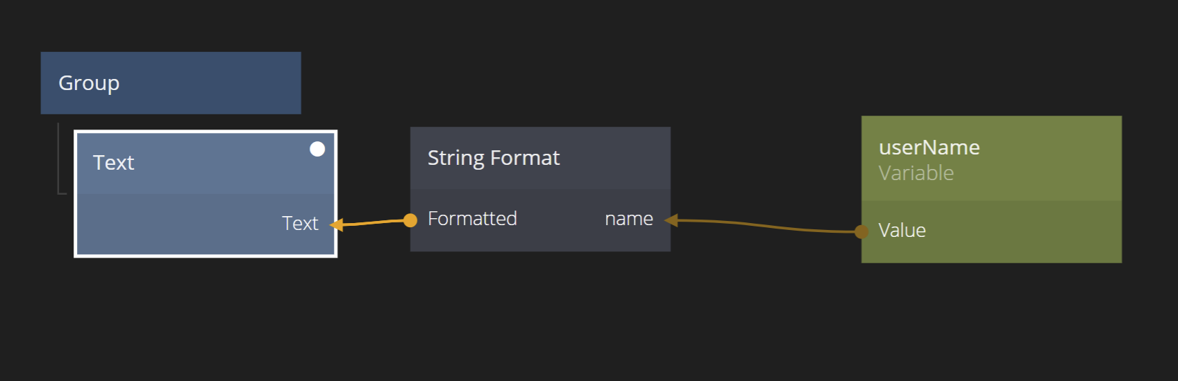 Connect the Value output of the Variable to the name input of the String Format node. Finally, connect the Formatted output from the String Format node to the Text input on the Text node.