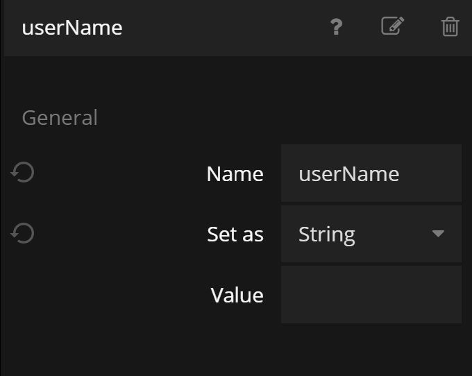 We will also set the type of the Variable to a String. This is important, for example, if the user chooses a username which are only numbers. With the String type set, we know even in that case, what's stored in this Variable is a String.