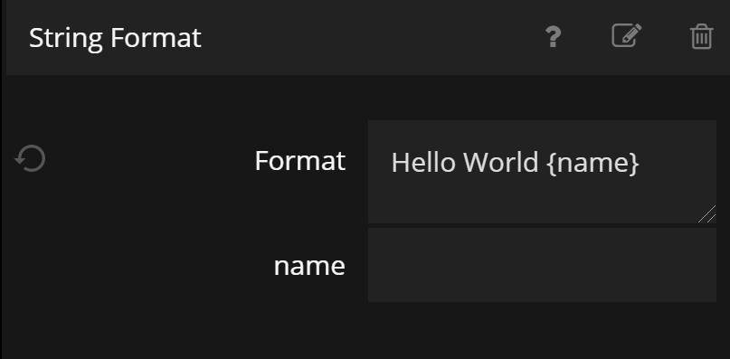 Ok, now we want to use the value we just stored. We want to include the name in the Hello World greeting. So lets first add a String Format node. Make sure the text in the node is "Hello World {name}".