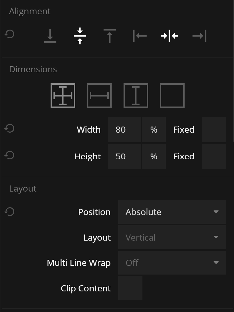 This will become our popup. In the new component. Change the size so it takes up 80% of the width and 50% of the height. Make it's layout "Absolute". Align it in the center. Also change the color to a nice color, perhaps blue.