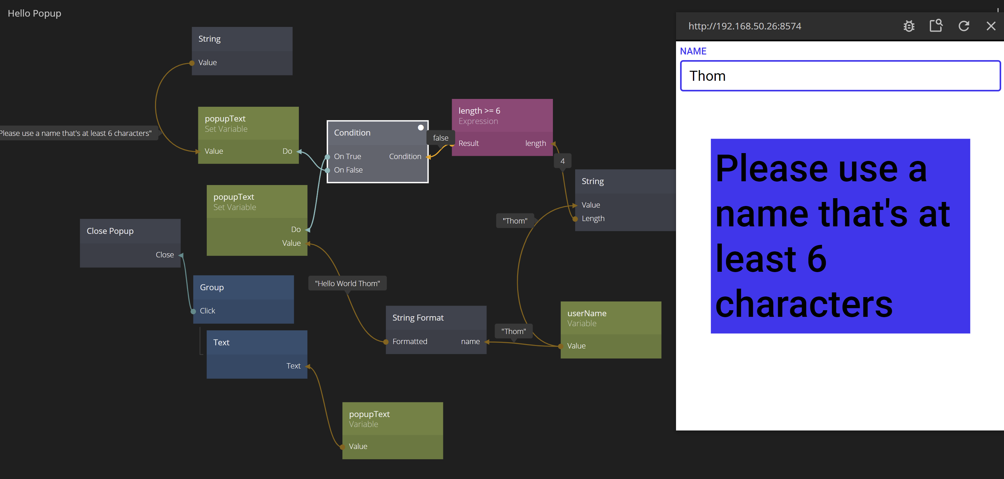 To back up for a second; what we have done now is to set the Variable userName when the user hits Enter. When the Variable have been set (the Done signal) we open a Popup with a new component. The component access the same Variable and shows the "Hello Message".