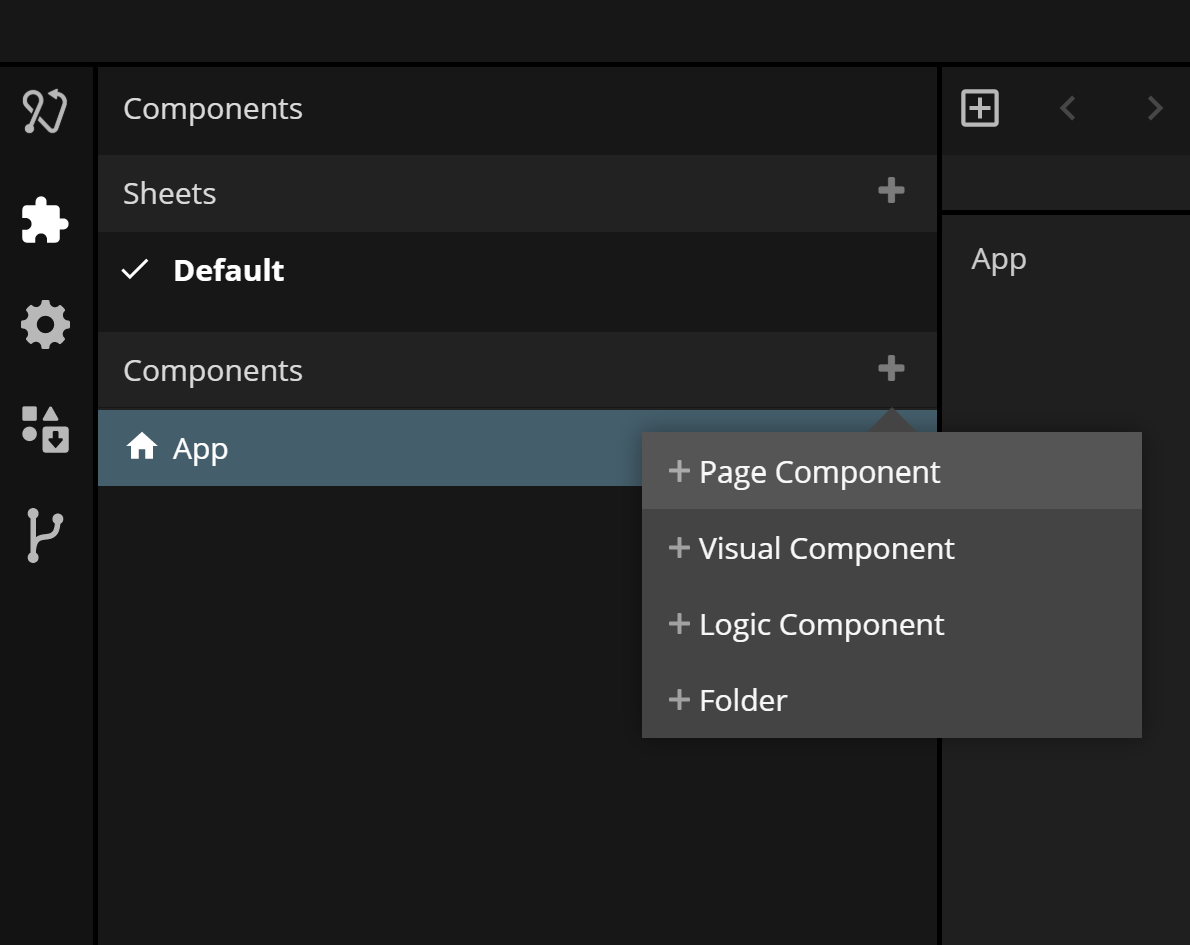 The next step is to add a few pages. The Page node is a bit special in the way that you cannot create it using the Node Picker. Instead you add it from the components sidebar as part of a component. Click "+" and the "Page Component". Call the page "Home".