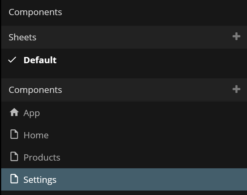 Then add two more pages, "Products" and "Settings". Your component list should look as the image below.