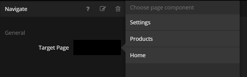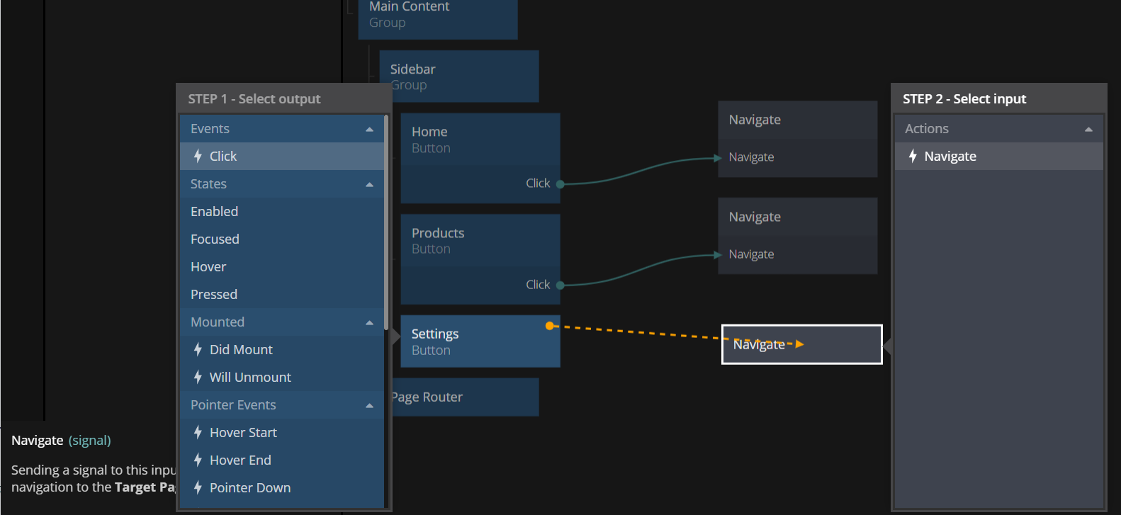 Finally we are going to connect this buttons to a Navigate node, that will trigger the page navigation. So create three Navigation nodes. When you click them, you will see that you can change their target page to either one of the Page Components that are available in the Page Router.