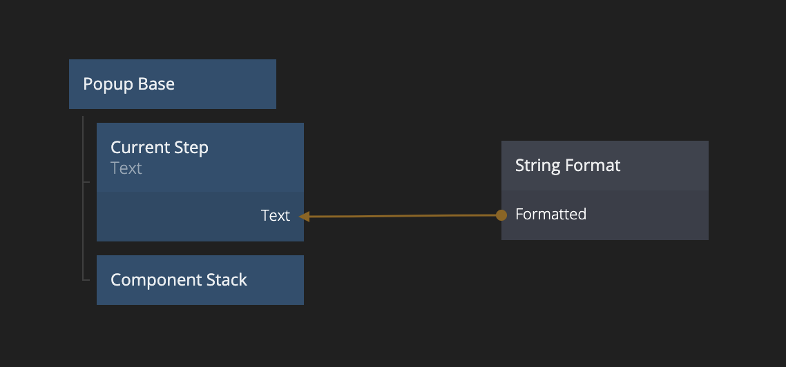 As content in that Popup we are going to start with a Text node which will be consistent in the Popup that holds the current step of the wizard. ("Step x of 3"). So add a String Format node with the string Step {current_step} of 3.