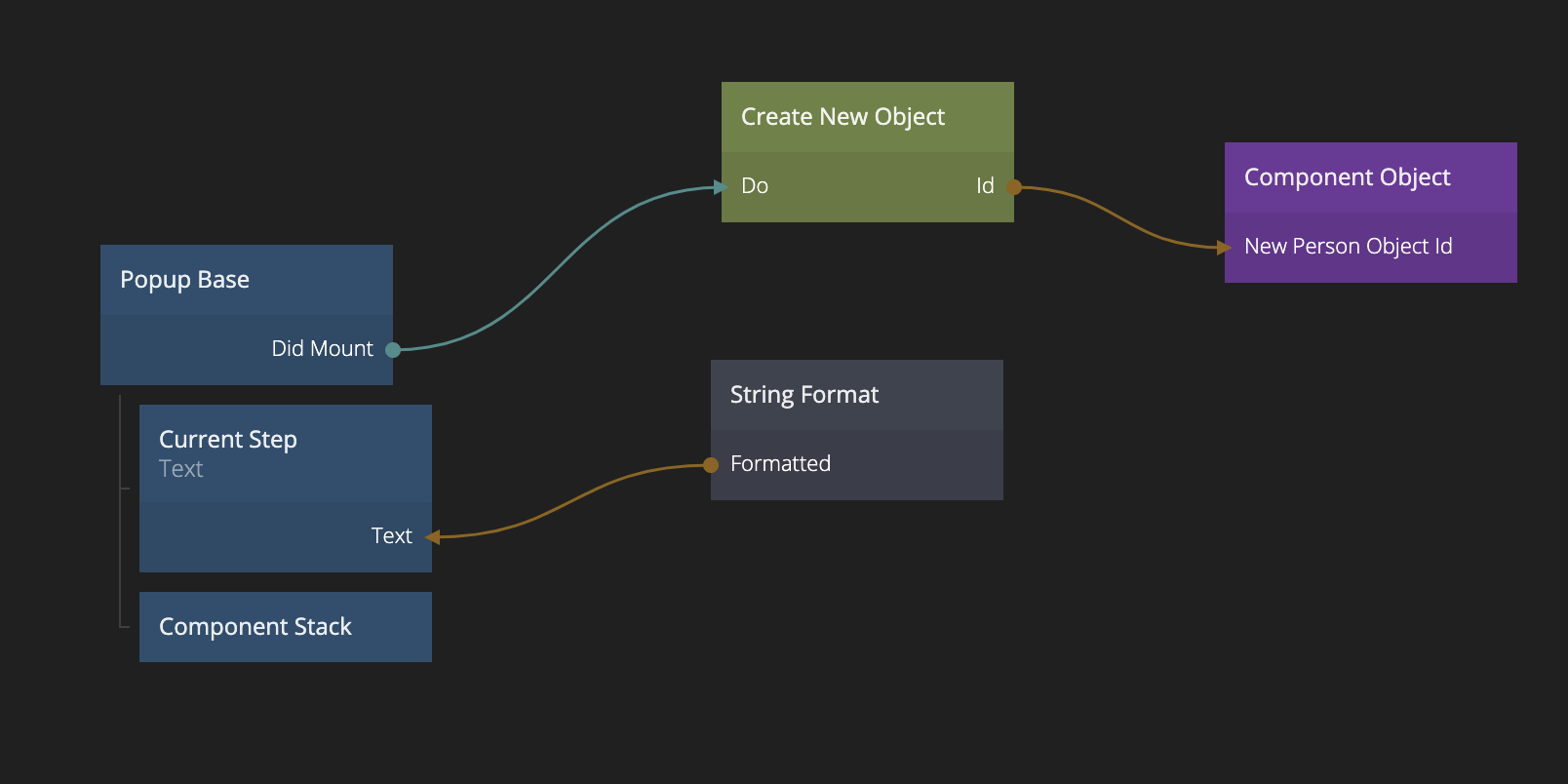 We can now connect the Did Mount signal from the Popup Base component to the Do signal of the Create New Object node in the Add New Person Popup, creating a new Object once the Popup opens.